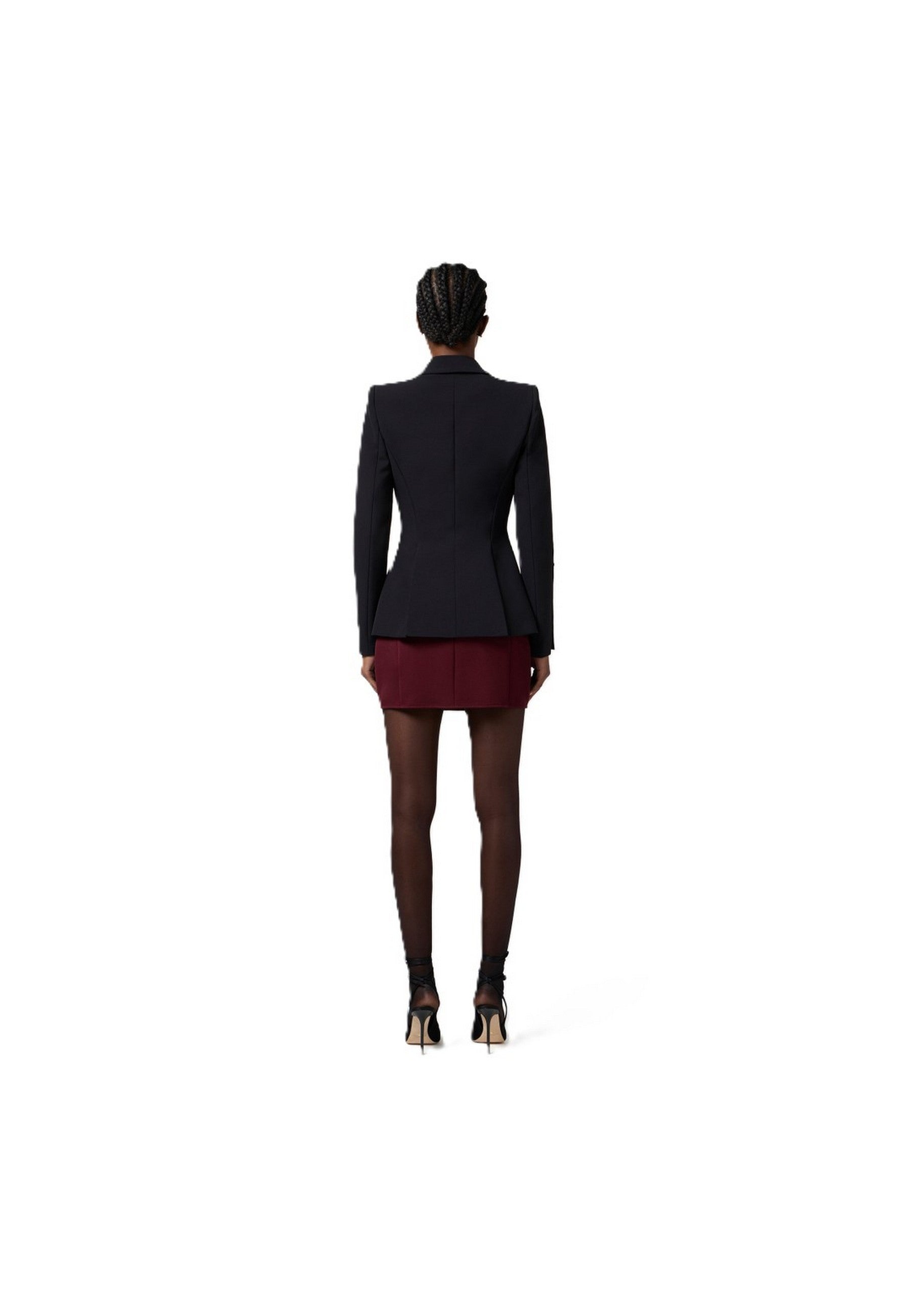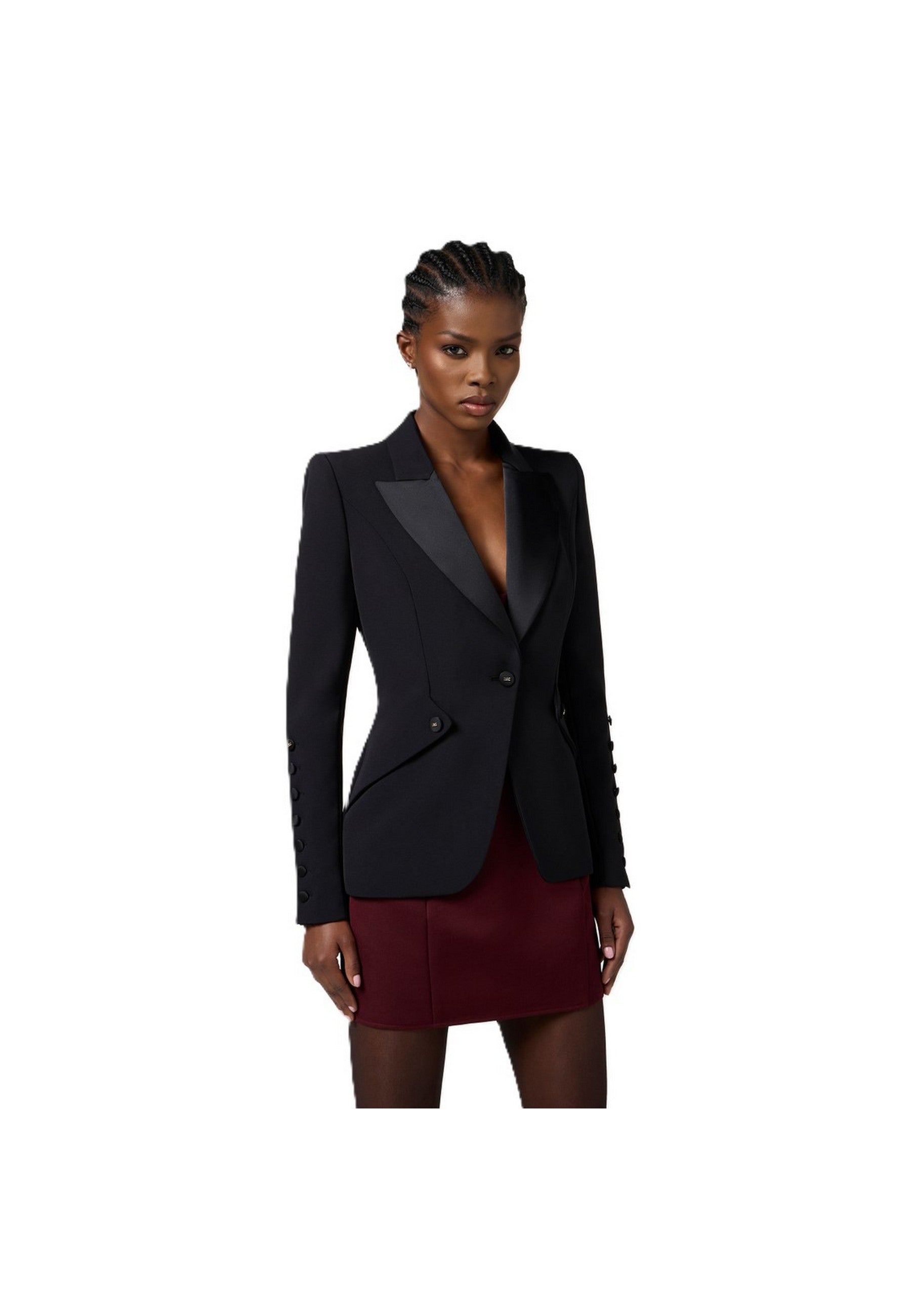 Ispirata al tuxedo maschile, questa giacca monopetto in crêpe leggero presenta una vestibilità slim e spalle strutturate che ne definiscono la linea. I rever a lancia in raso aggiungono un tocco sofisticato, mentre i bottoni tono su tono mantengono l’eleganza essenziale del capo. Le maniche si distinguono per gli ampi spacchi, chiusi da pratici bottoni a pressione, per uno styling versatile e moderno.