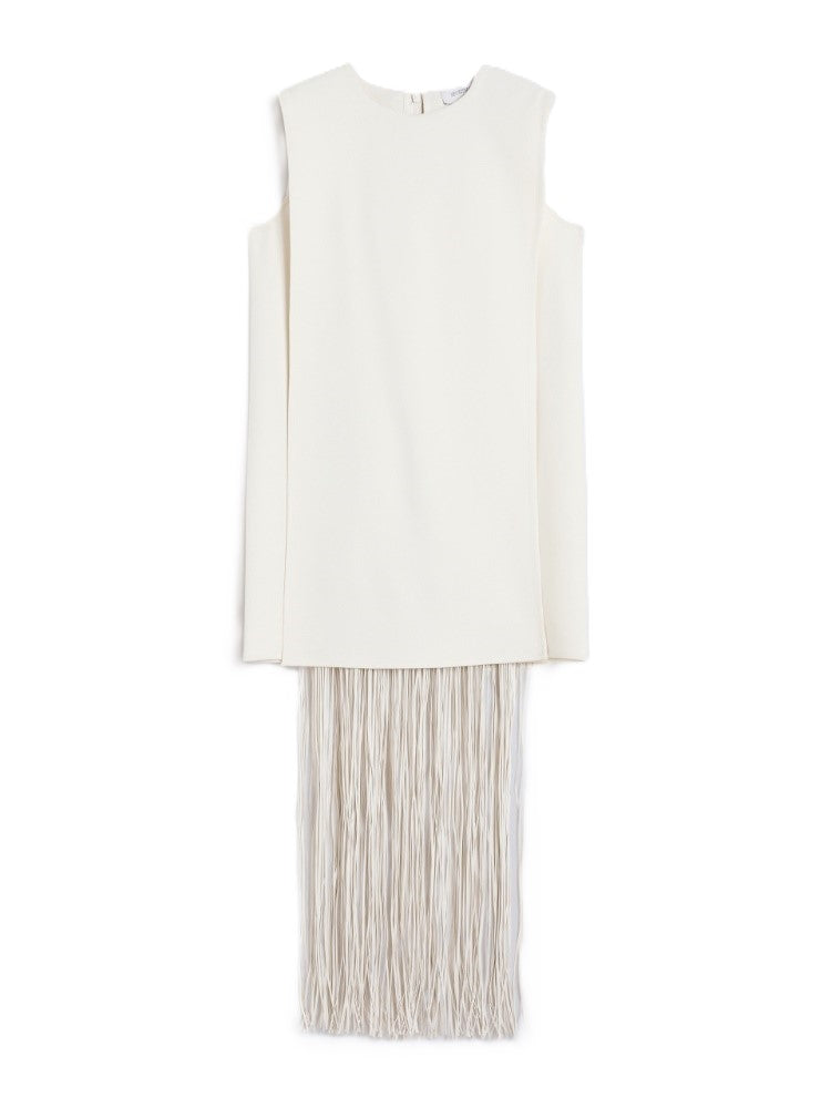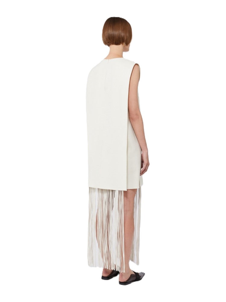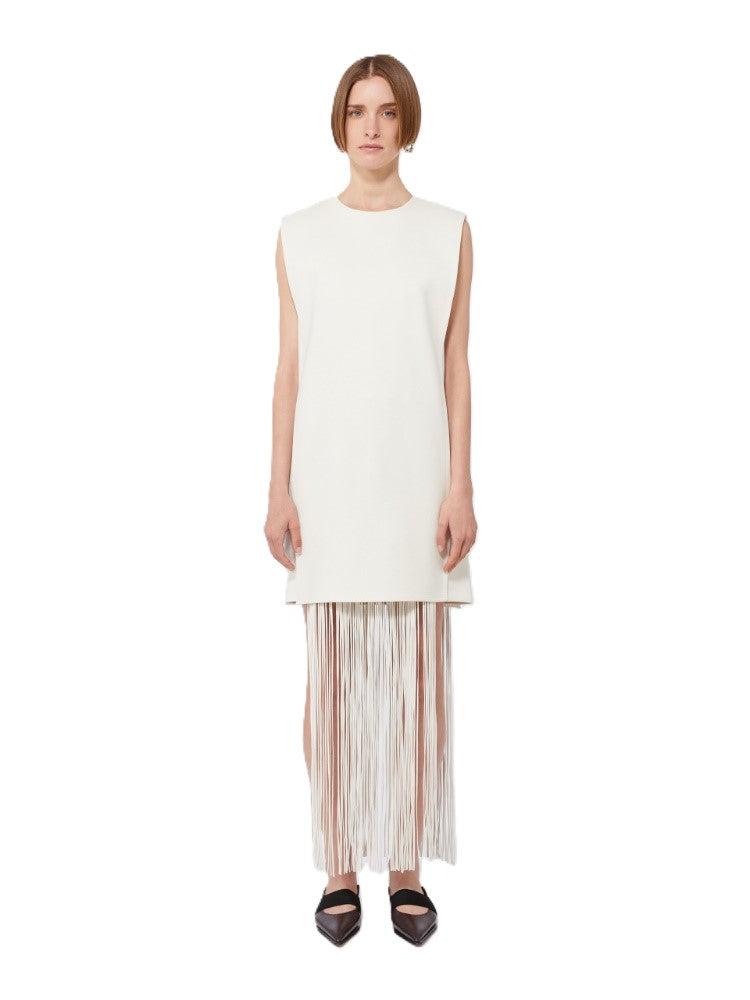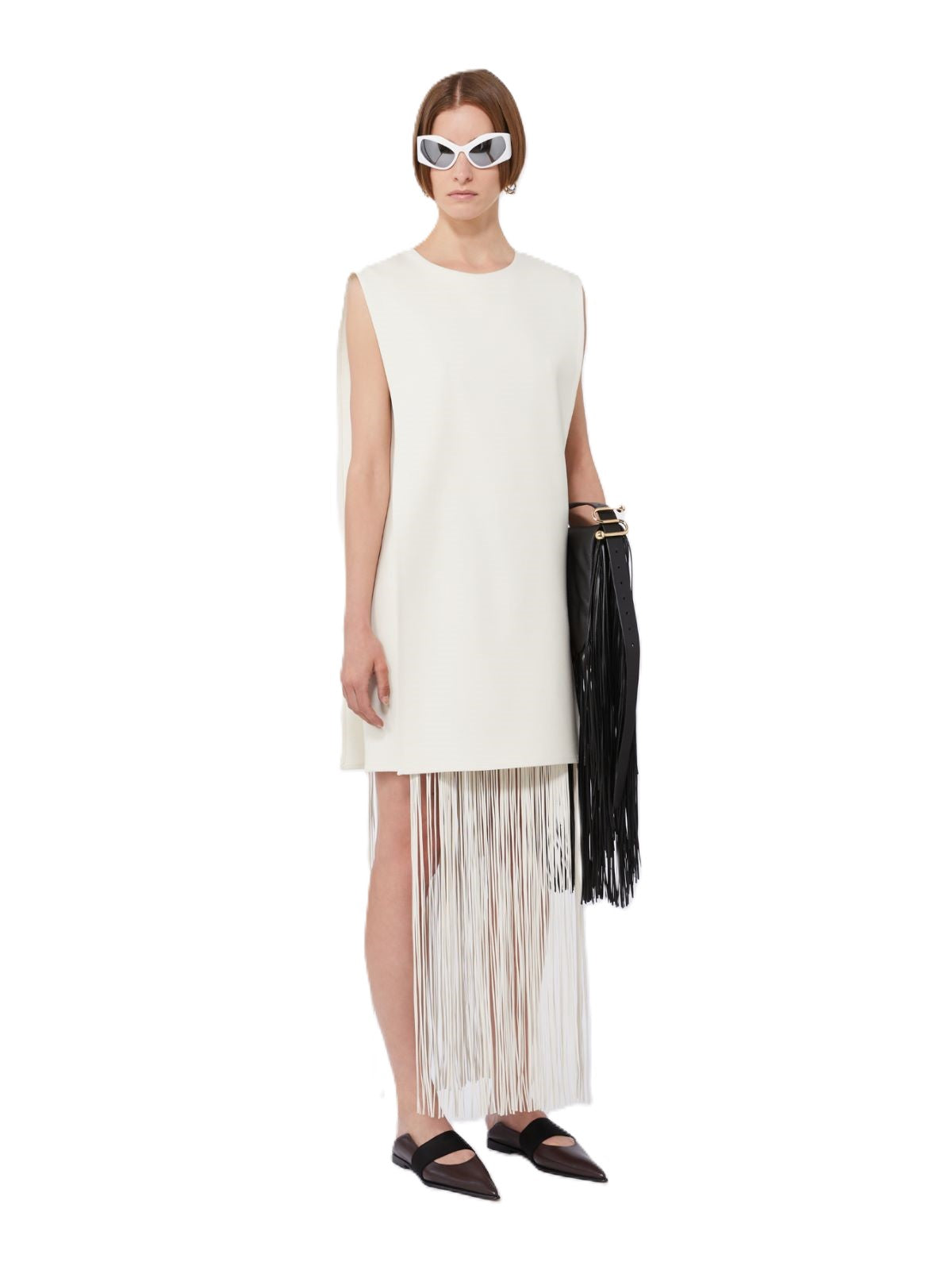 Abito girocollo con frangeAbito dritto e corto, con linea smanicata e girocollo. Realizzato in cady di cotone e viscosa, è completato da un pannello sovrapposto sia sul davanti che sul retro. Le frange staccabili creano un gioco di lunghezze asimmetriche ondeggiando ad ogni passo.
