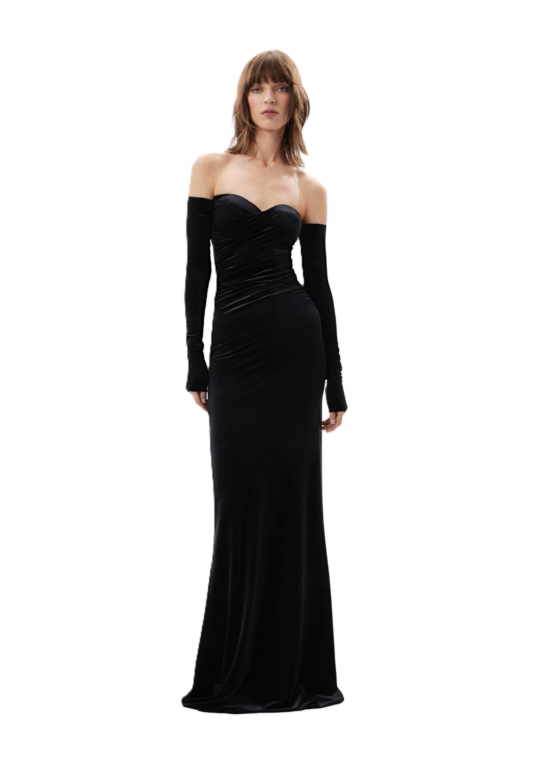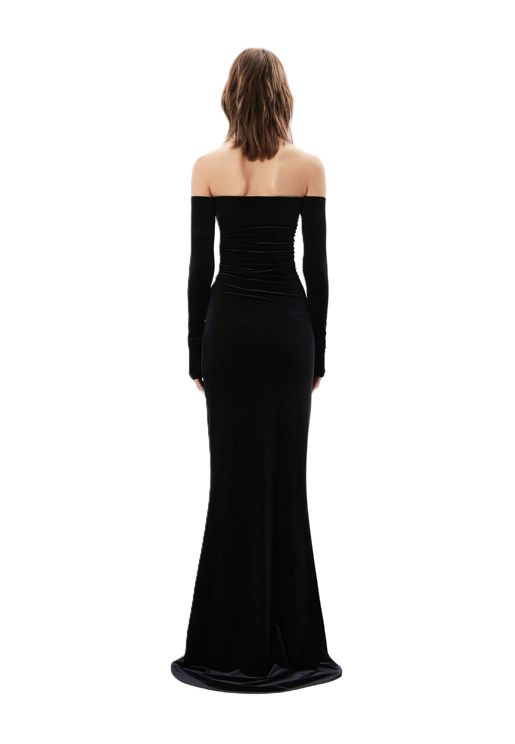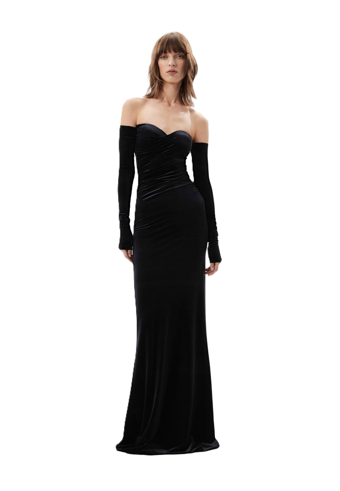 Caratterizzato da un corpetto drappeggiato con spalle scoperte e coppe preformate, scollo a cuore, arricciature asimmetriche e maniche separate tagliate al vivo, emana una femminilità audace. La gonna si allarga in una delicata silhouette a sirena, rifinita con un orlo tagliato al vivo per un tocco di raffinata naturalezza.abito in velluto.TAGLIA UNICA – Adatto dalla taglia XS alla M.