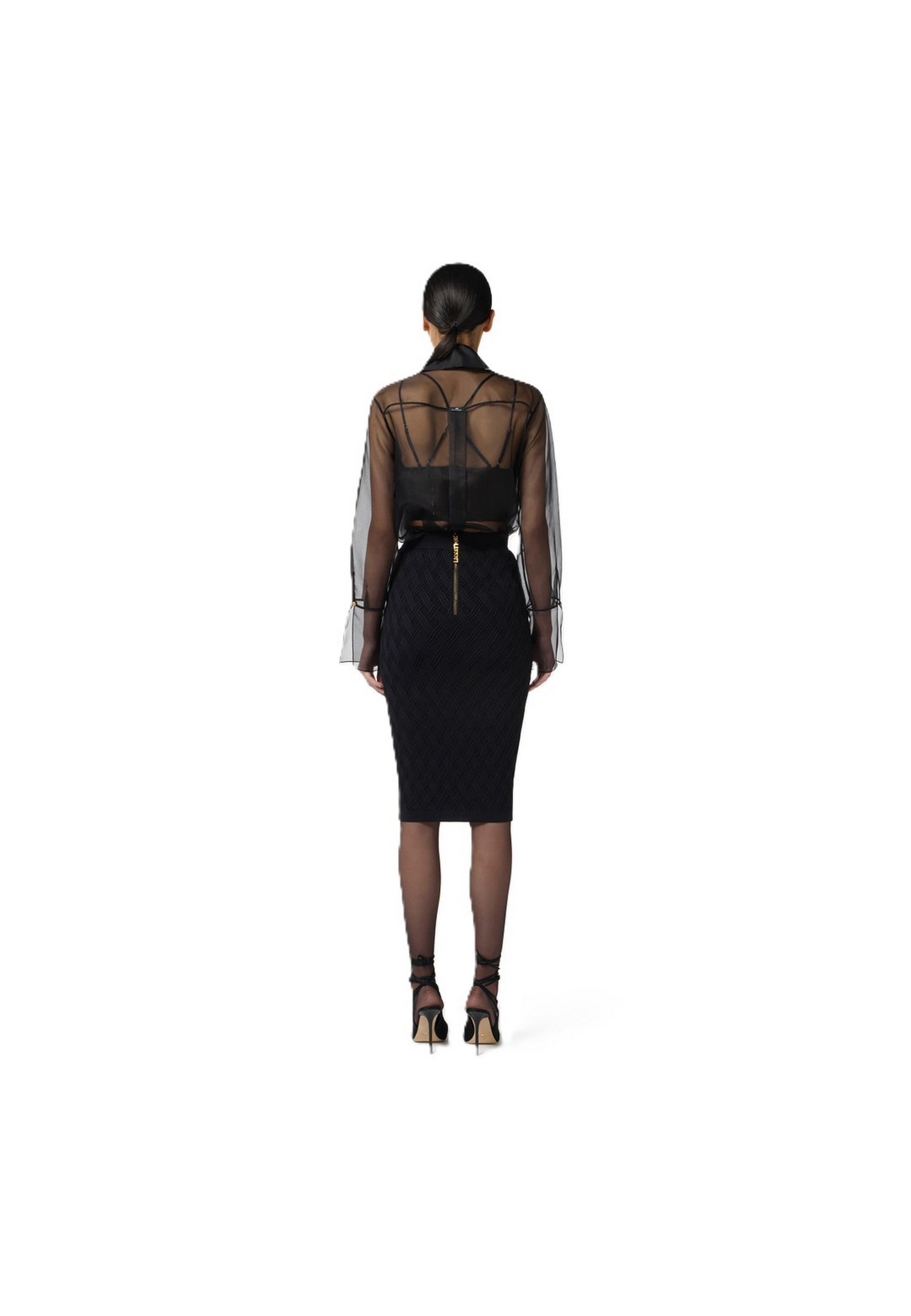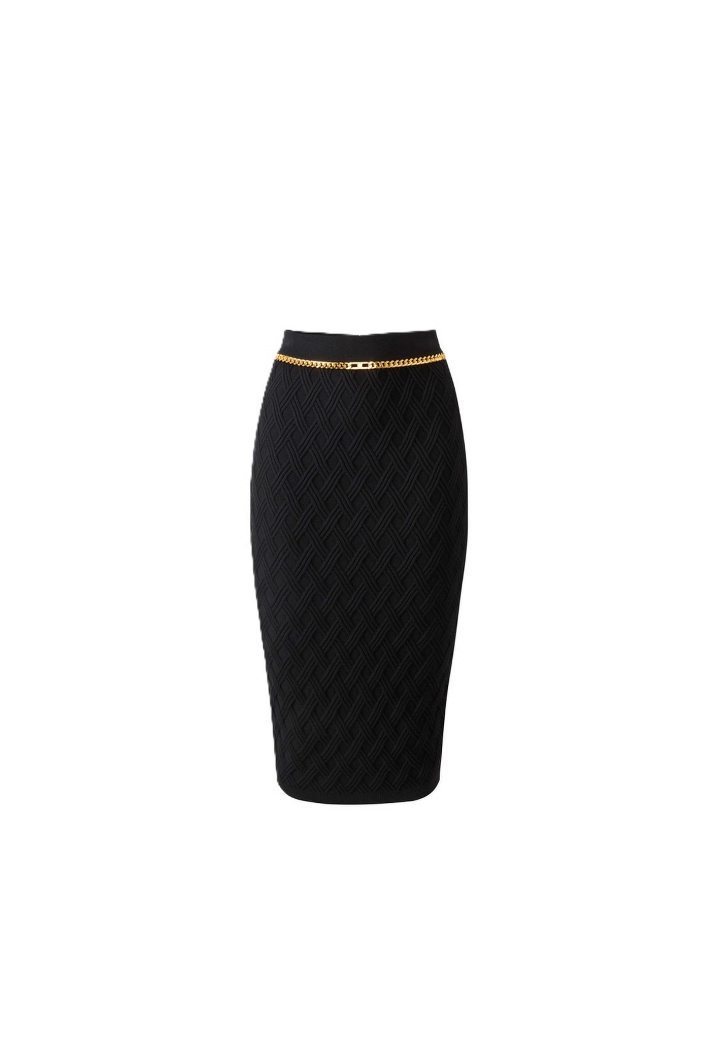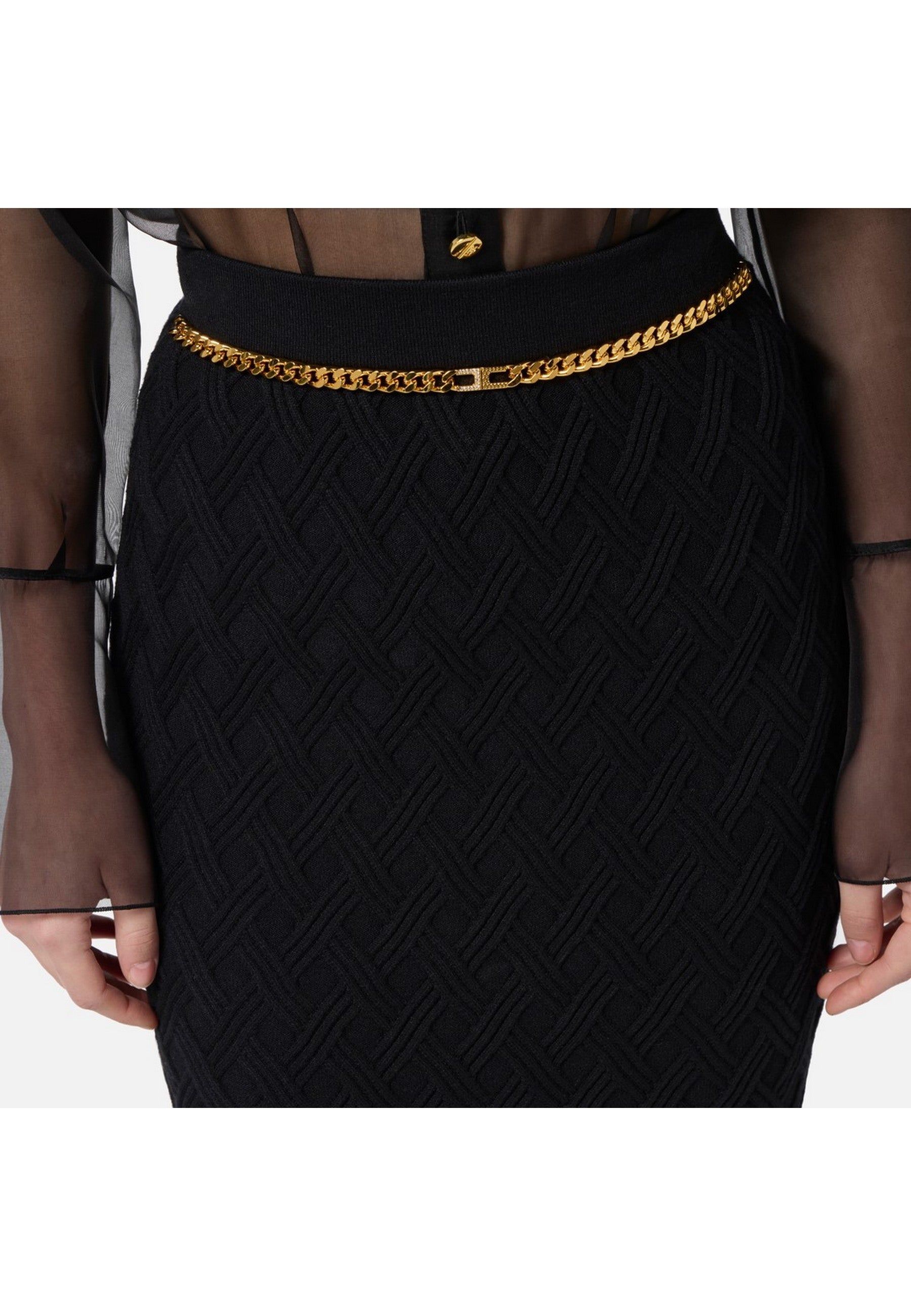 Realizzata in maglia dalla linea aderente, questa gonna si distingue per l’elaborata lavorazione tridimensionale a rombi, che dona texture e movimento. Il dettaglio gioiello con logo aggiunge un tocco di luce e raffinatezza, rendendo il capo perfetto per look femminili e sofisticati.