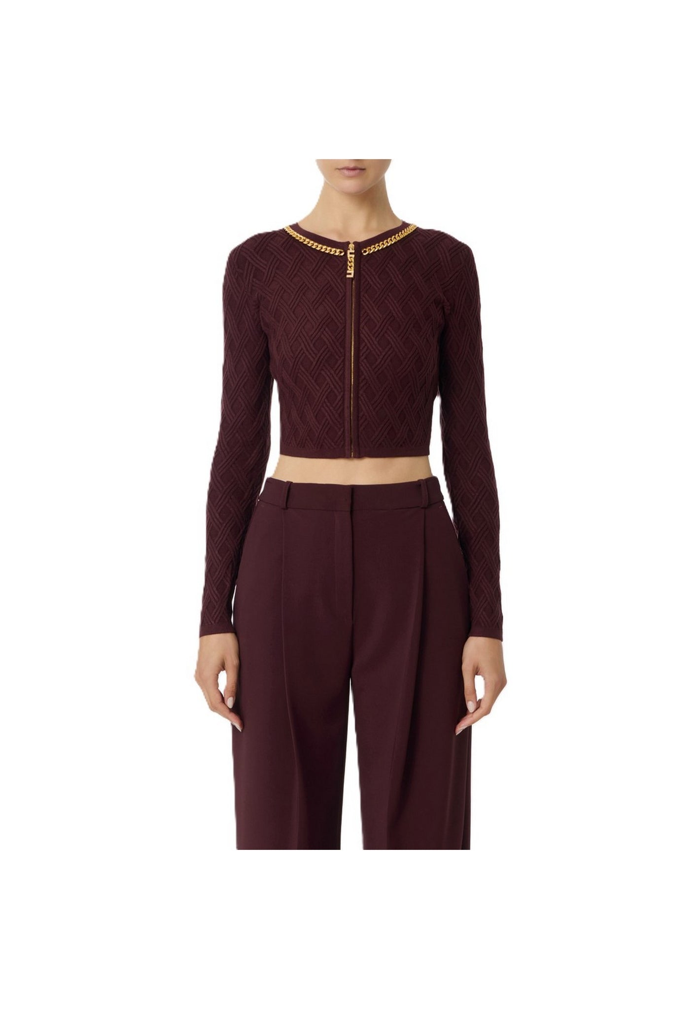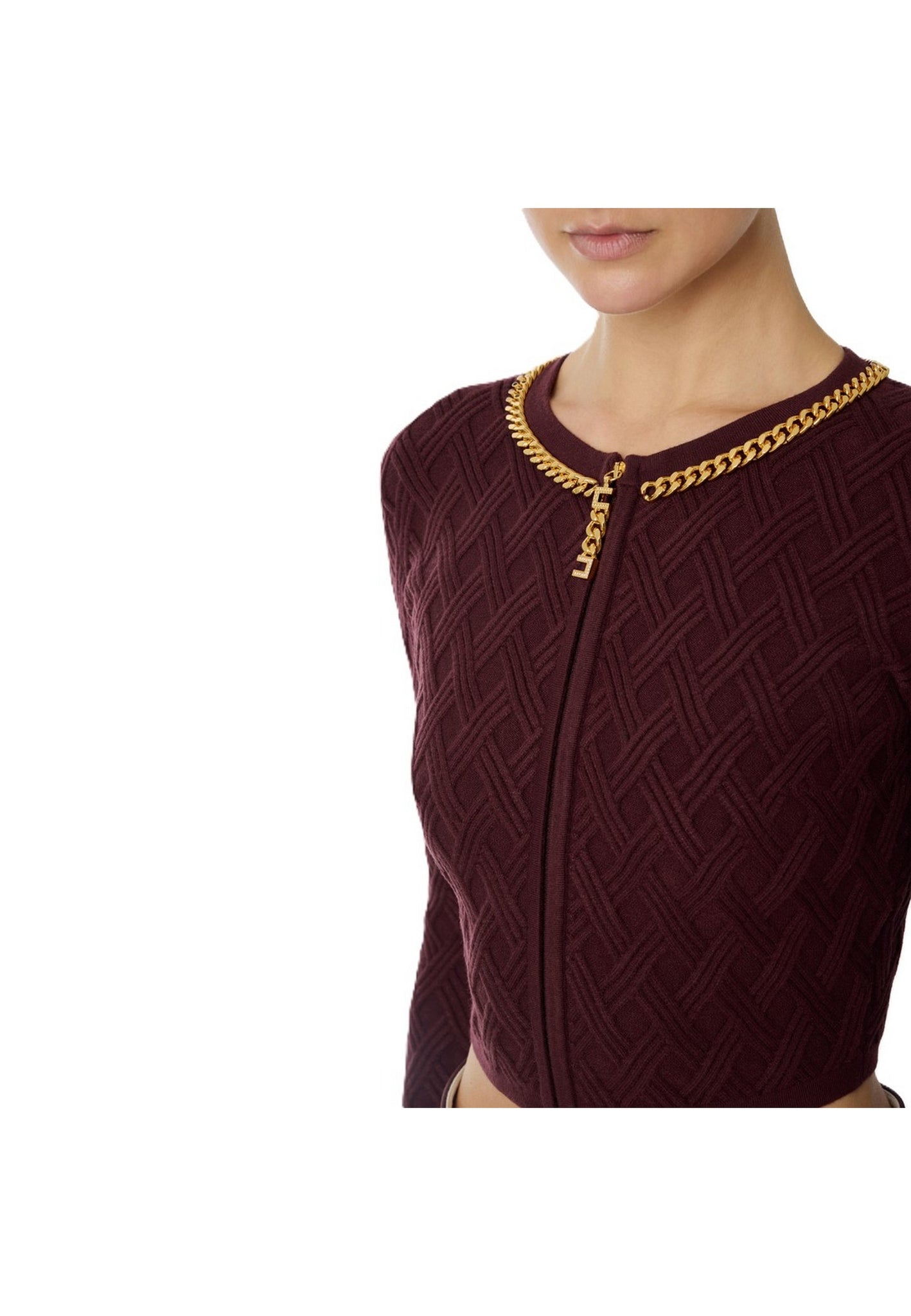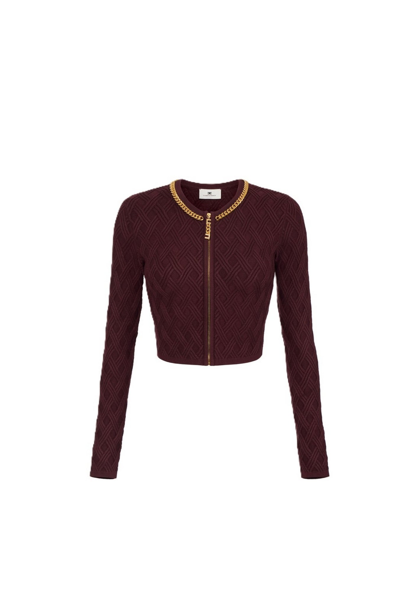 Cardigan in maglia dalla vestibilità aderente, definito da un’elegante lavorazione tridimensionale che disegna un motivo geometrico a rombi su tutta la superficie. Il design è completato da maniche lunghe, girocollo e una zip frontale arricchita da una catena con taglio diamantato. Il tirazip gioiello con logo aggiunge un tocco luminoso e distintivo.
