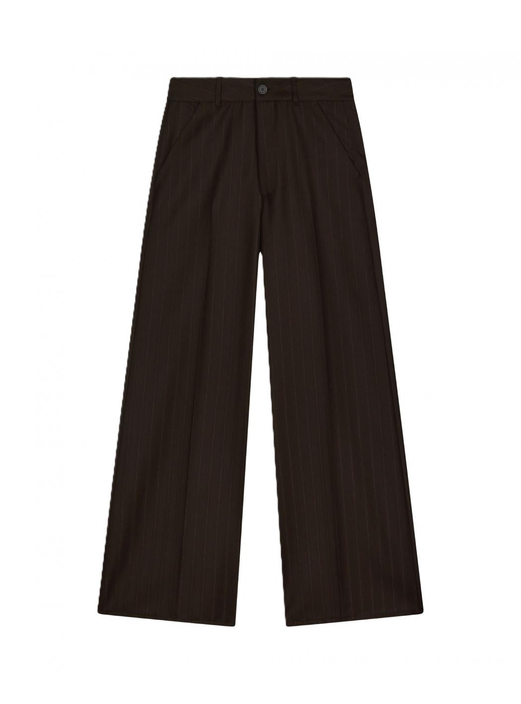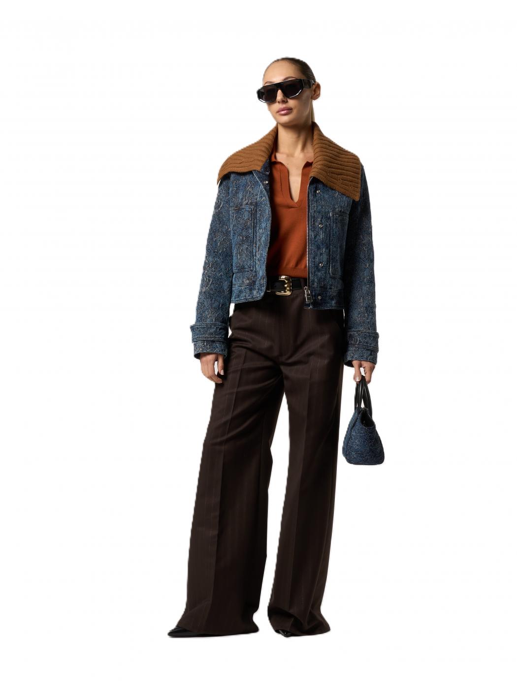 Pantaloni Idra wide leg chino, vita bassa, tasche a filetto posteriori. Gessato lurex riciclato. Logo Dondup. Made in Italy