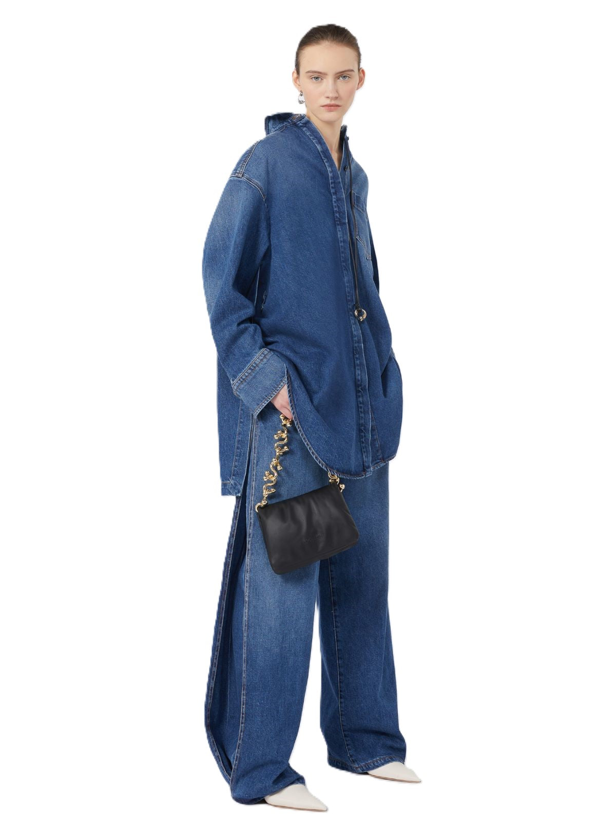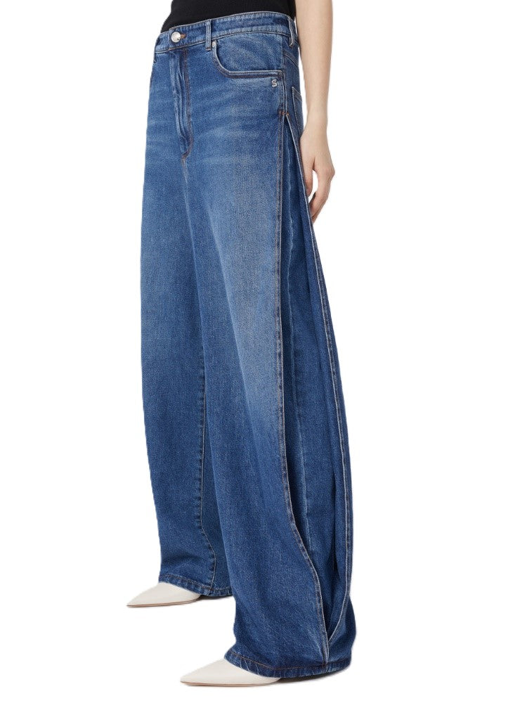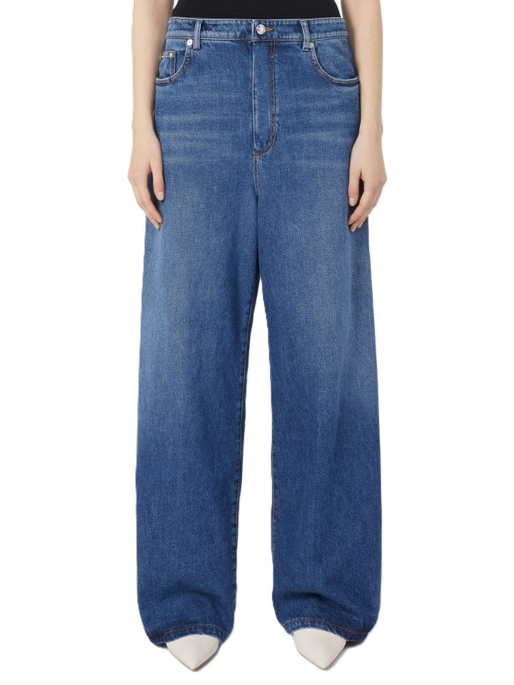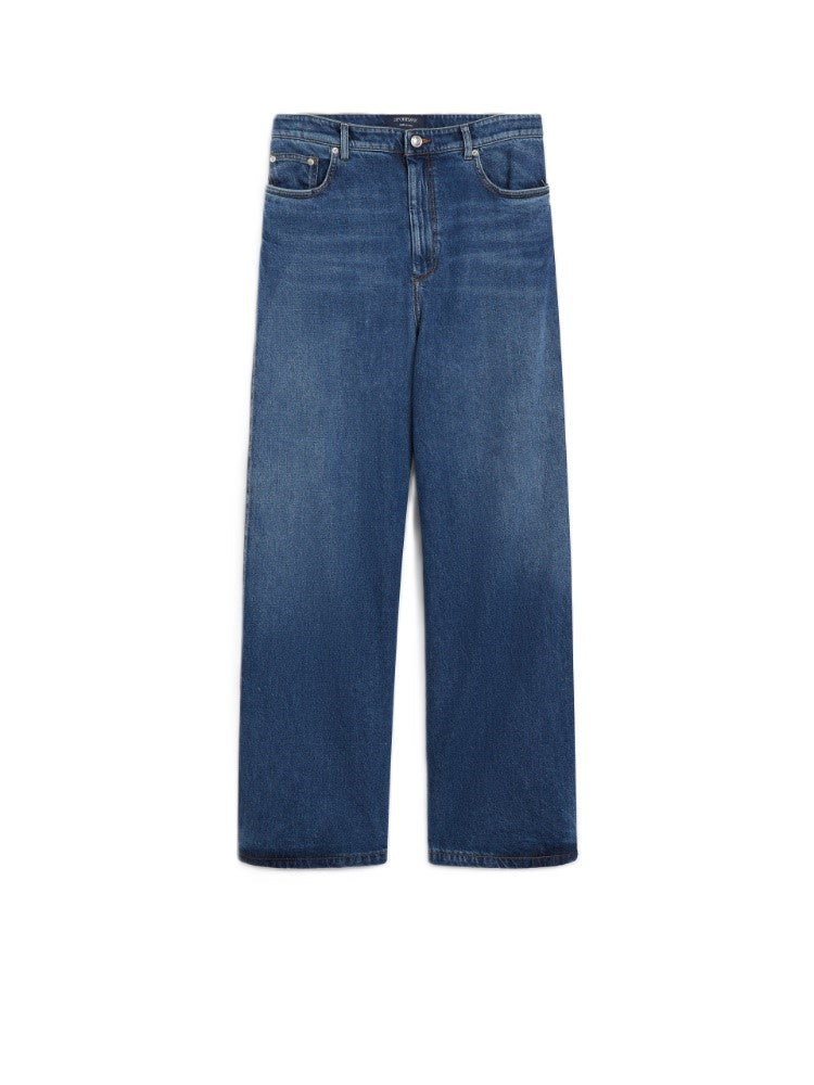 Nuovi volumi e taglio morbido per il jeans 5 tasche realizzato in denim fermo. La costruzione a vita bassa è caratterizzata da contropiego laterale sulla gamba, che ne aumenta l'ampiezza.