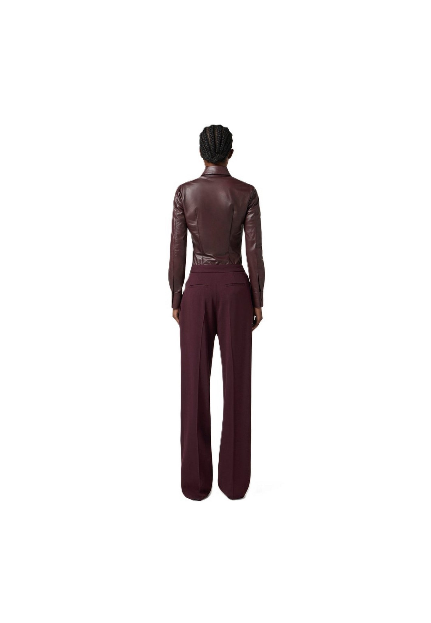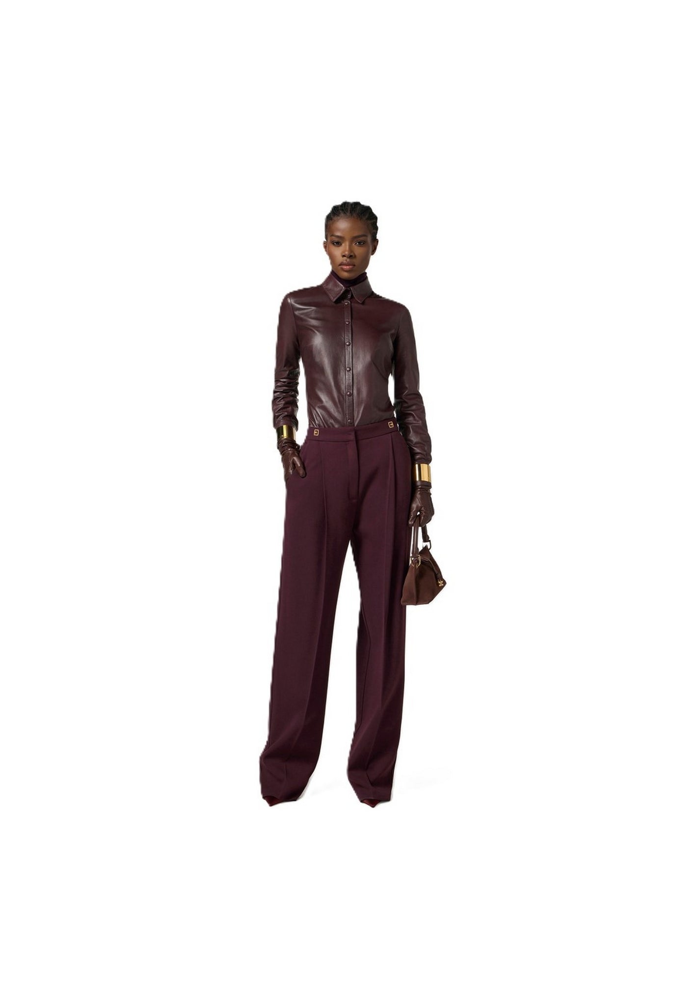 Realizzati in crêpe dalla linea regular, questi pantaloni si distinguono per la costruzione a doppia pinces che valorizza il volume e la struttura del capo. Il design è completato da raffinati dettagli in metallo dorato con logo, applicati sul fascione, per un tocco di eleganza discreta ma riconoscibile.