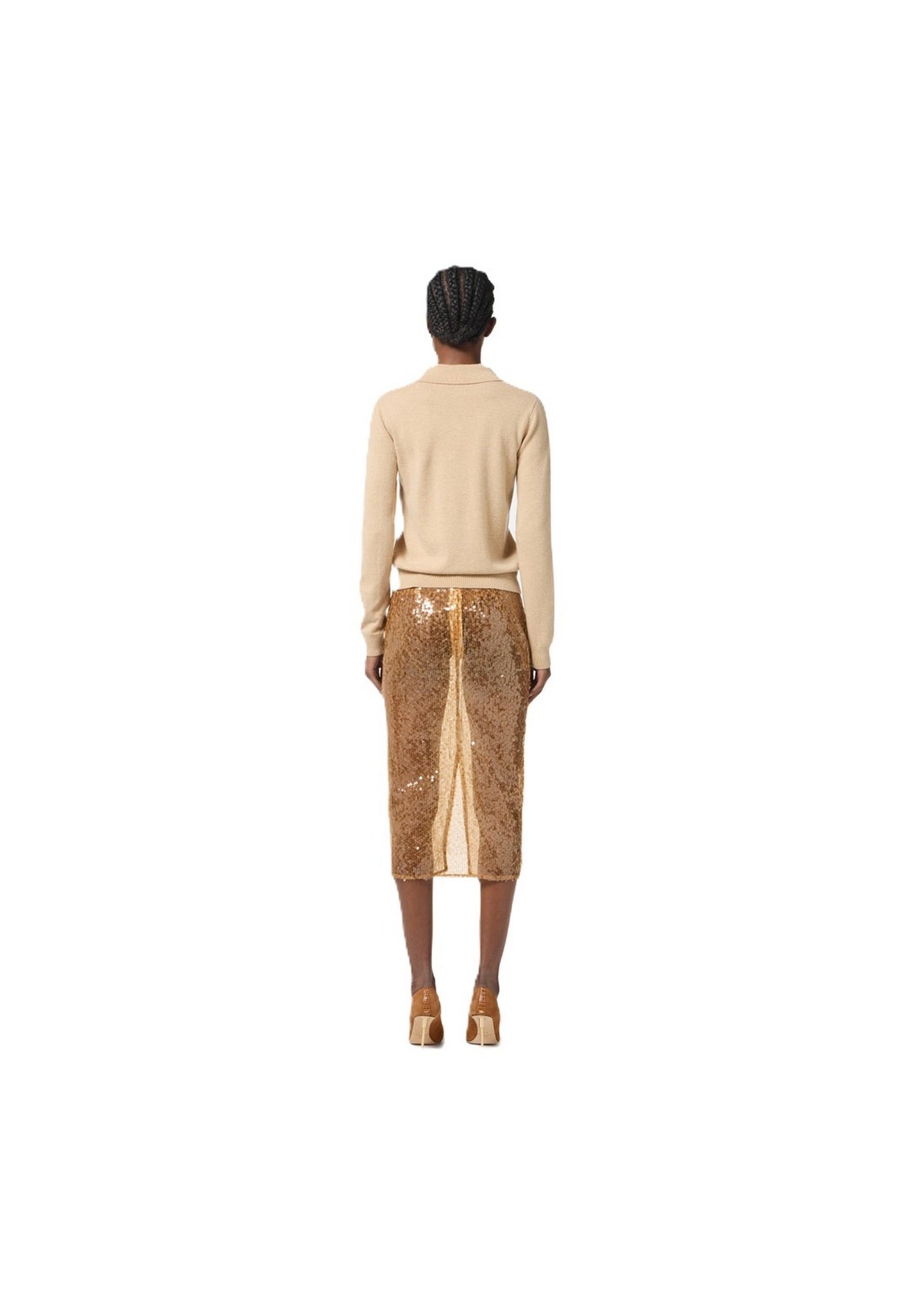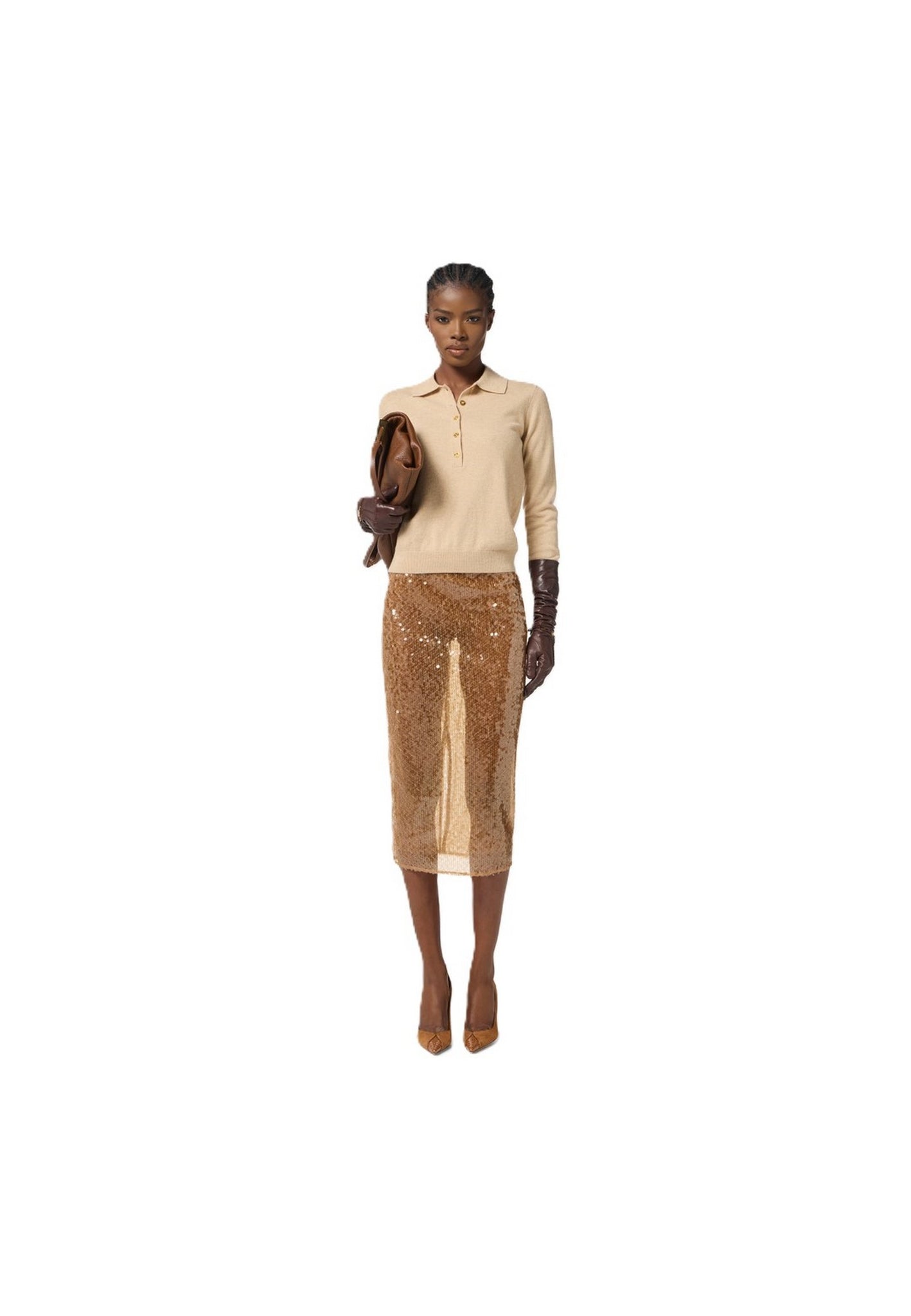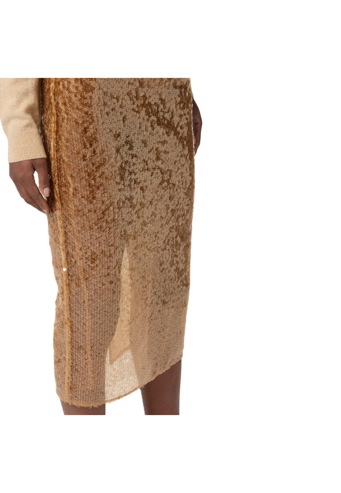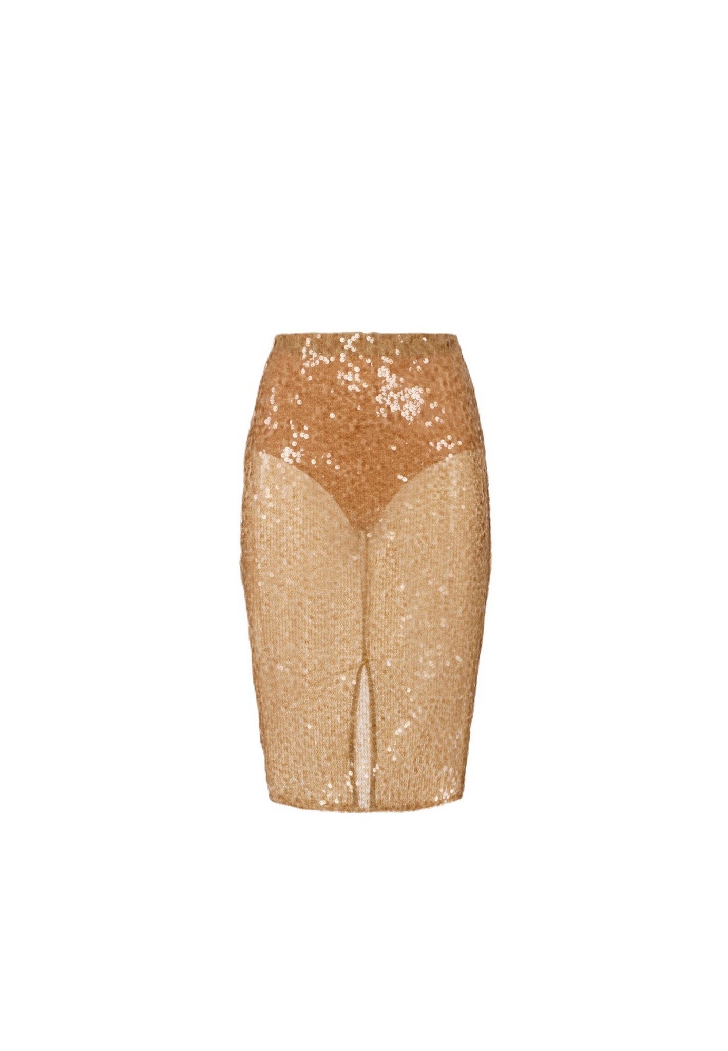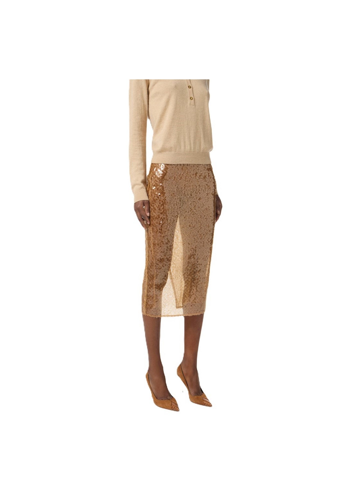 Gonna midi dalla vestibilità aderente. Si distingue per la texture in full paillettes che rende il capo protagonista.