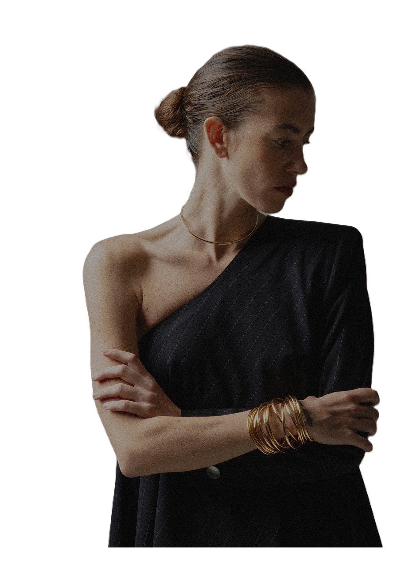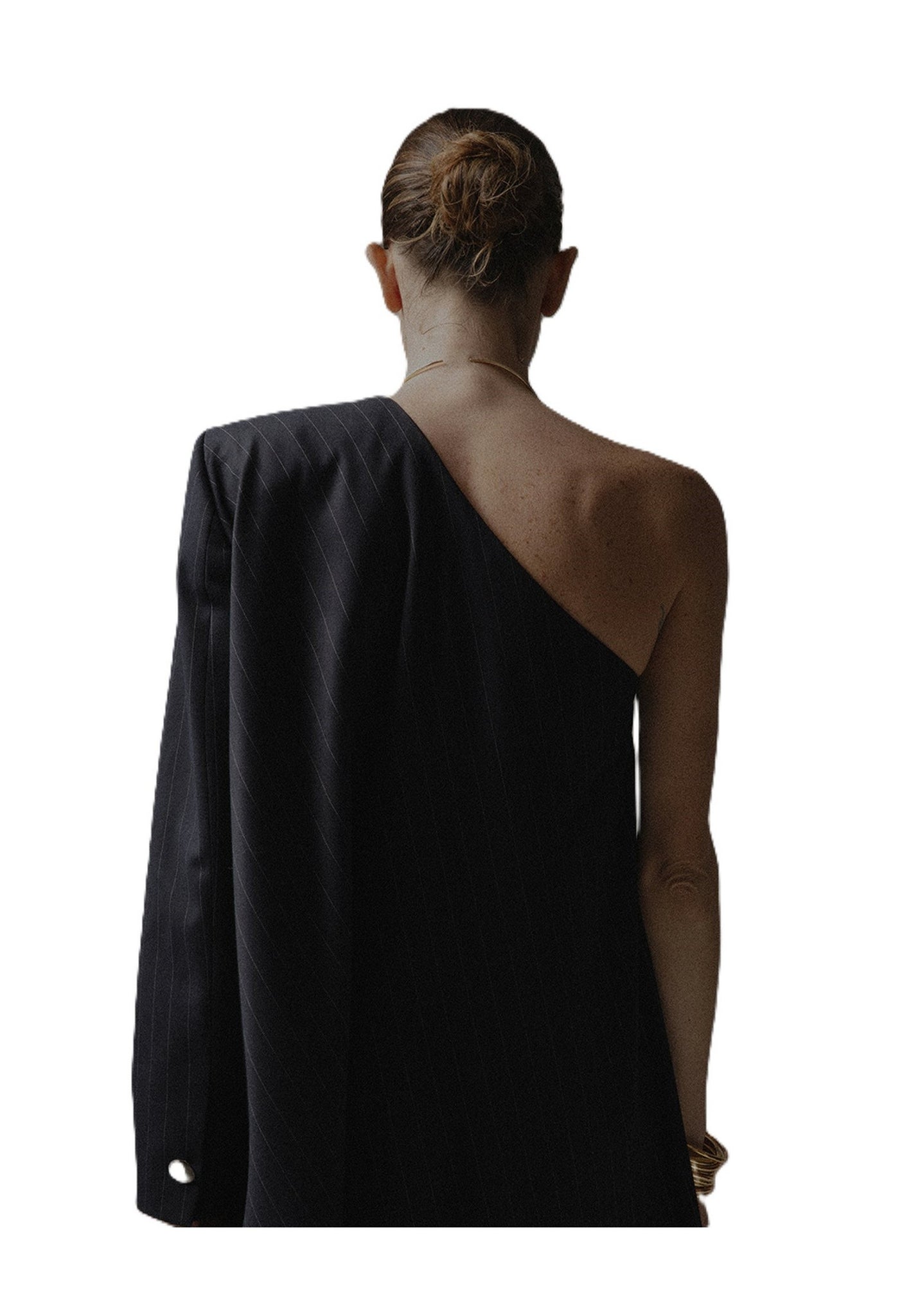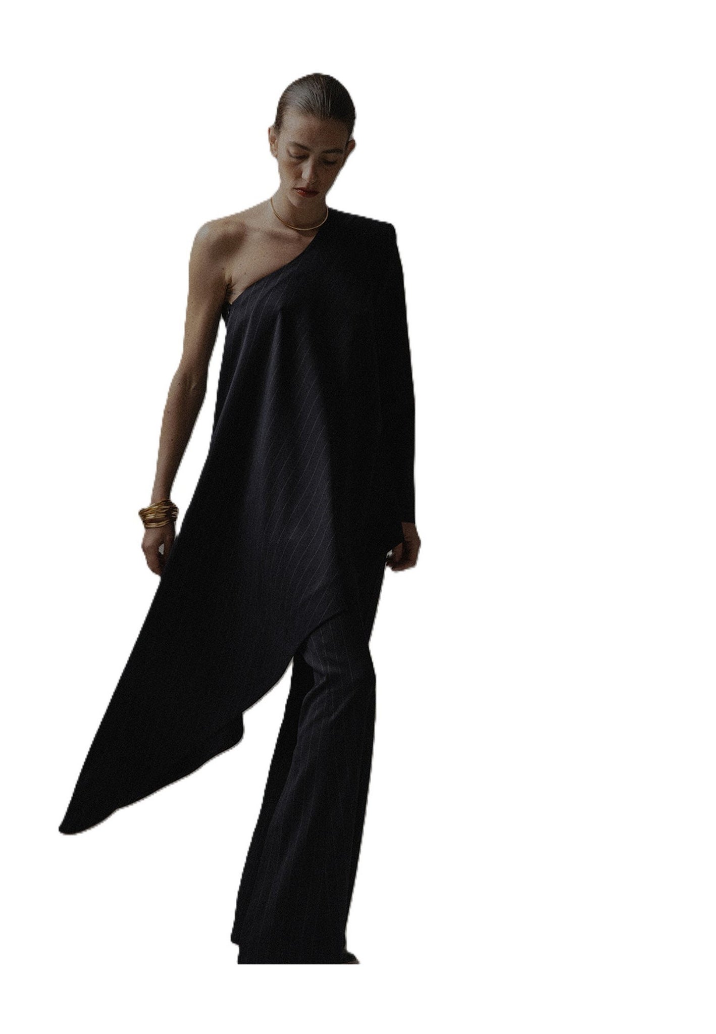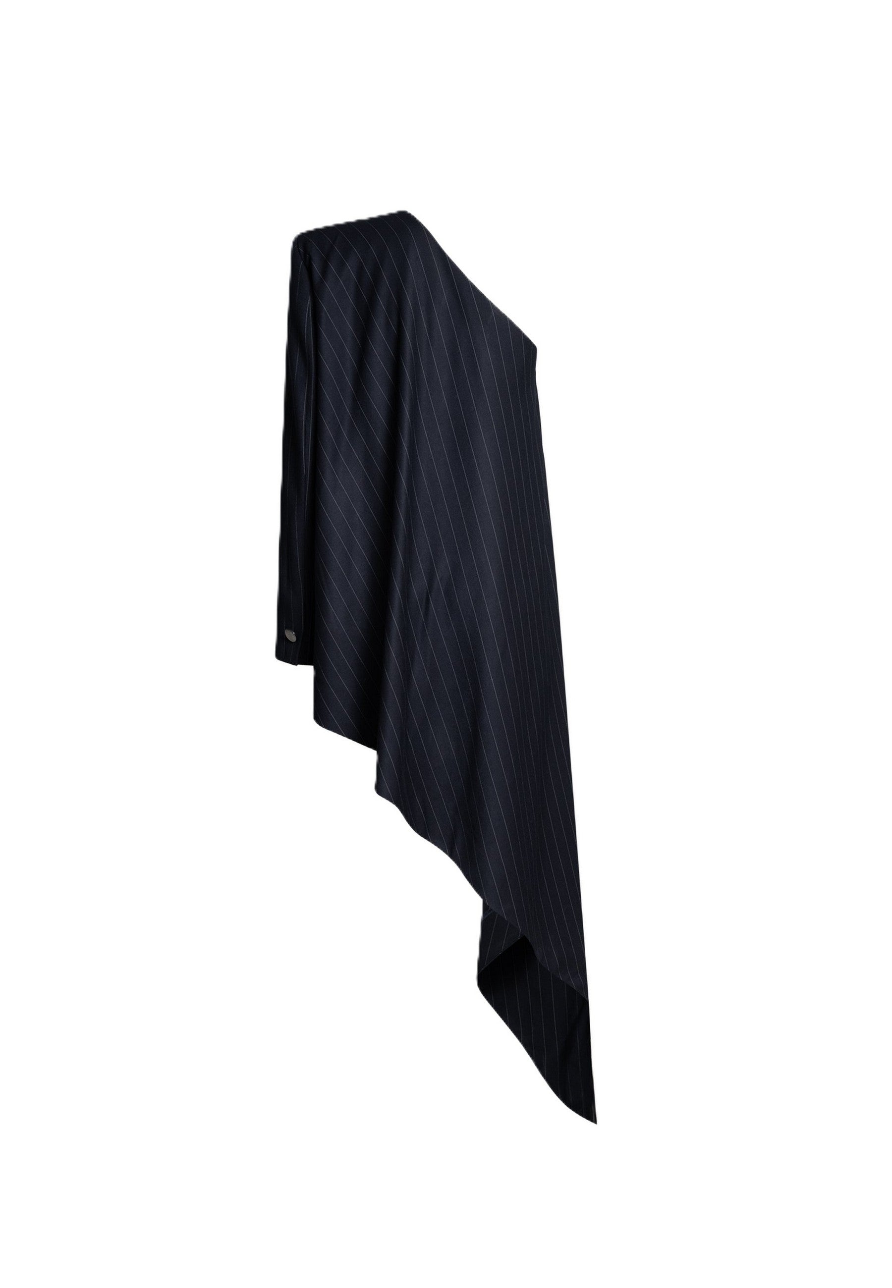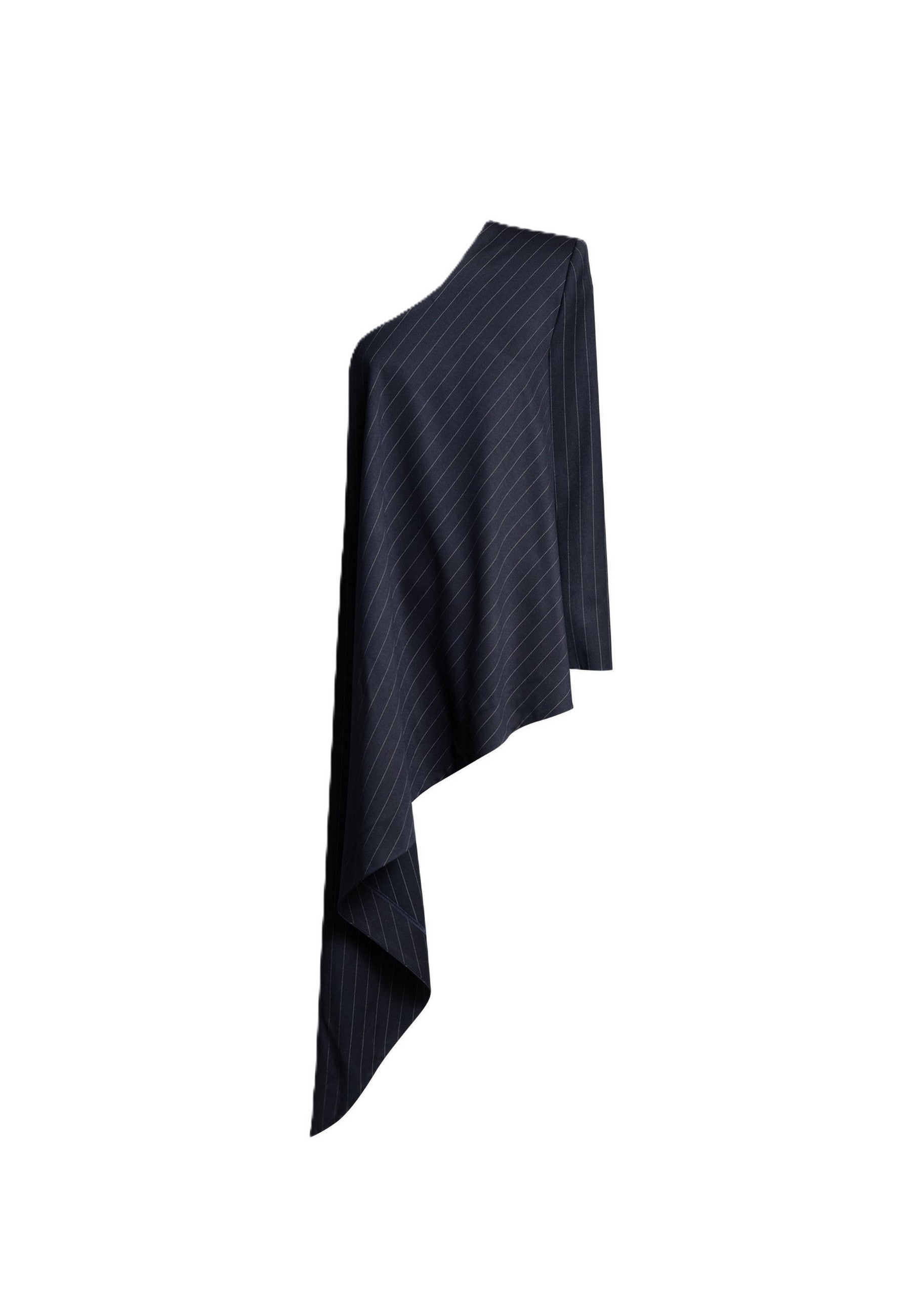 Scopri il top donna monospalla in tessuto gessato, un capo raffinato che unisce linea asimmetrica e drappeggio fluido per valorizzare la silhouette con eleganza moderna.