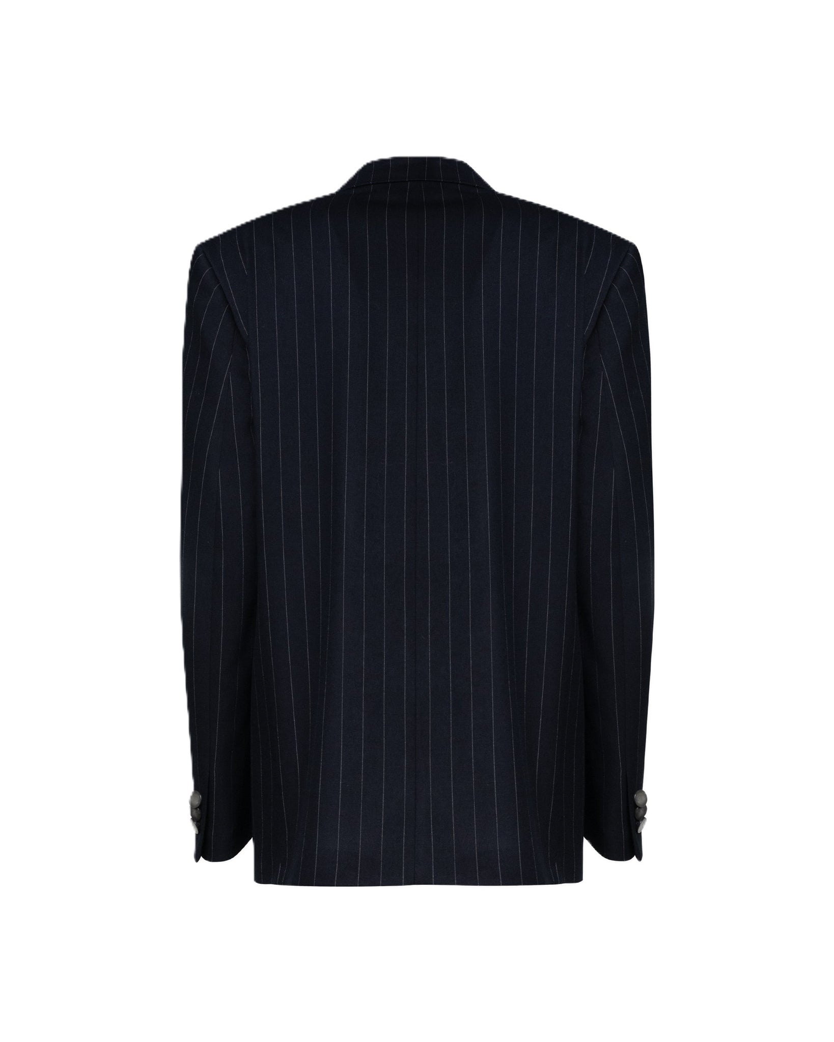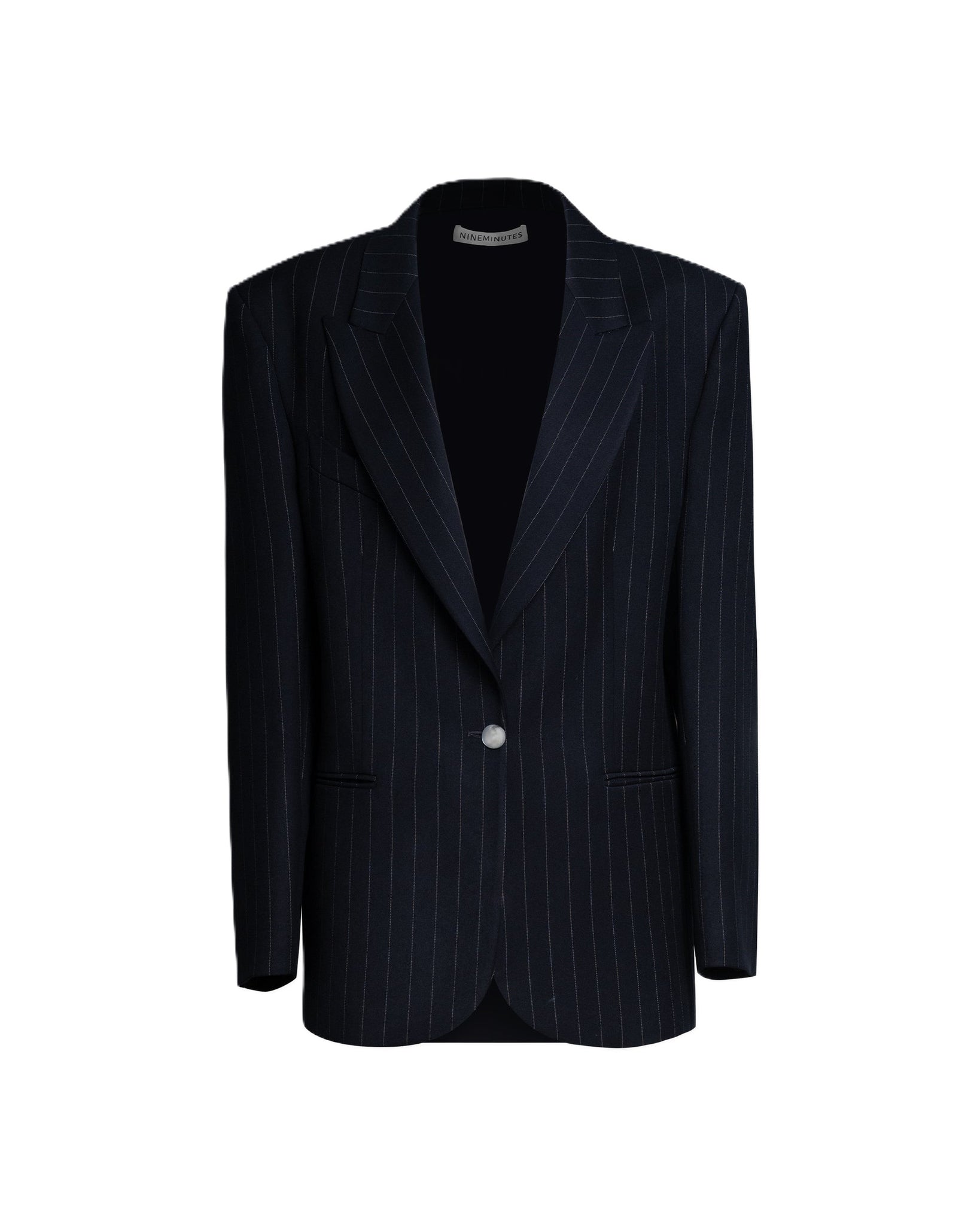 Blazer donna gessato dal taglio sartoriale, con spalle strutturate e chiusura monopetto a un bottone.