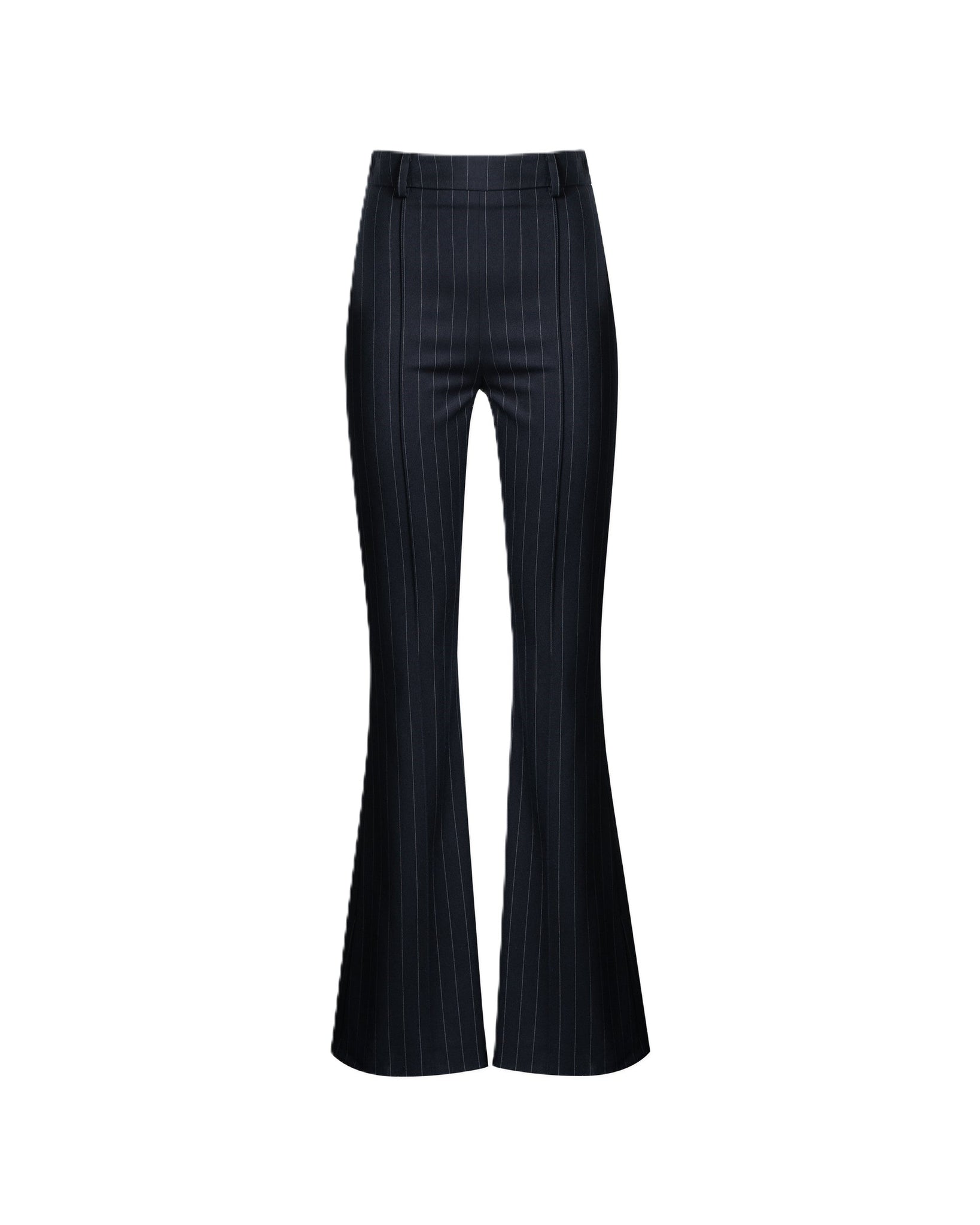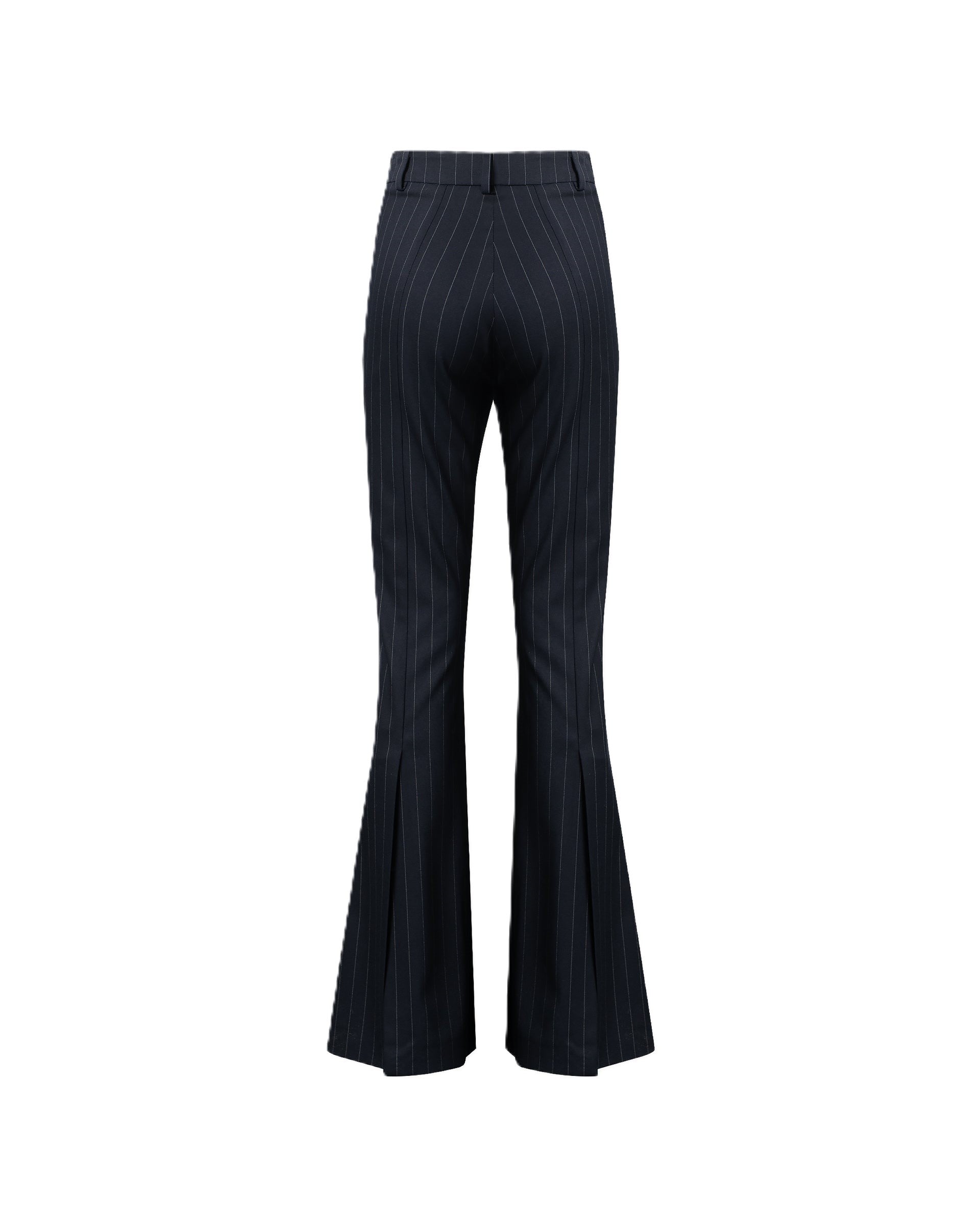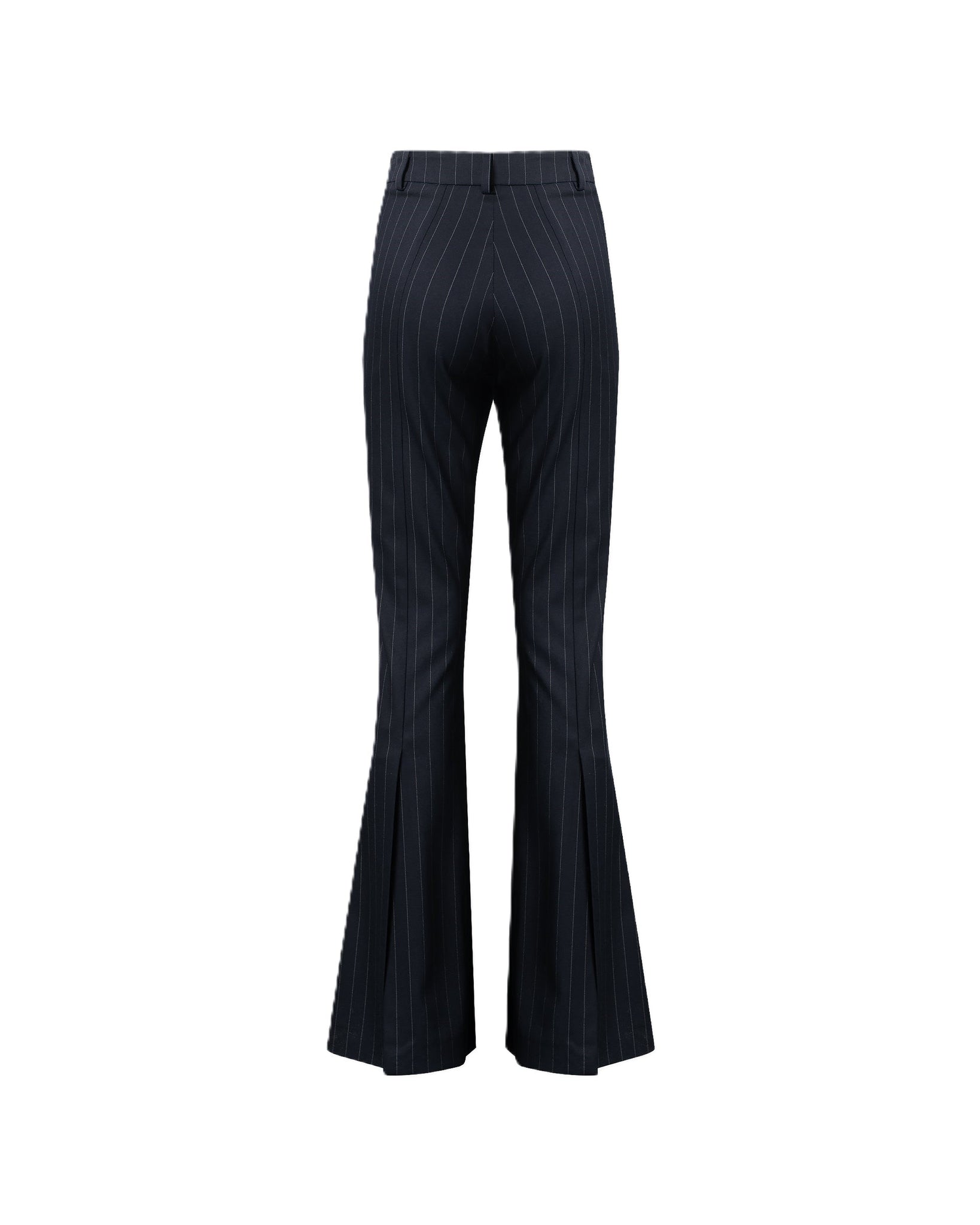 Pantaloni a zampa gessati, con spacchi posteriori fondo gamba. Vita alta e pence centro avanti. Chiusura con zip laterale