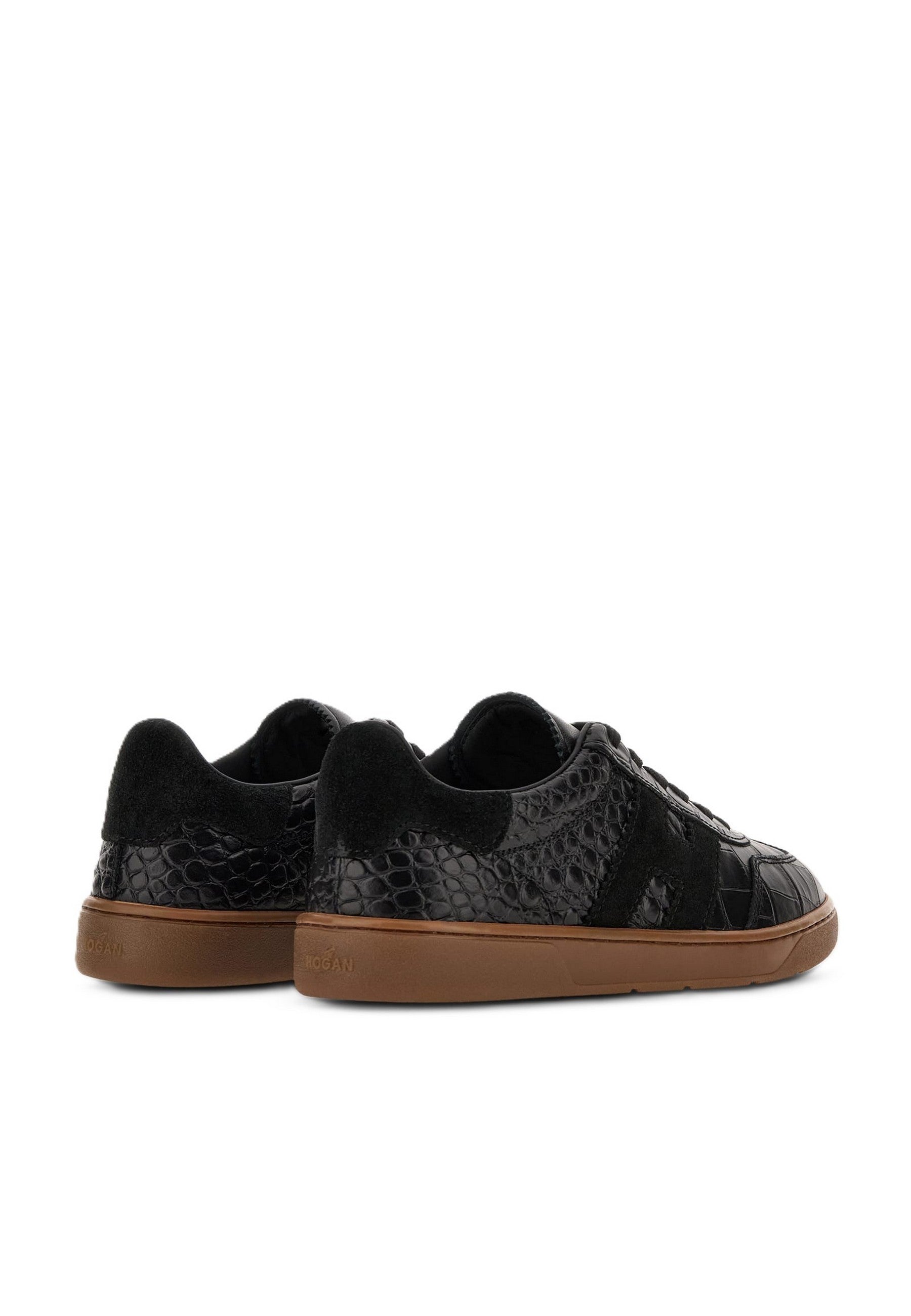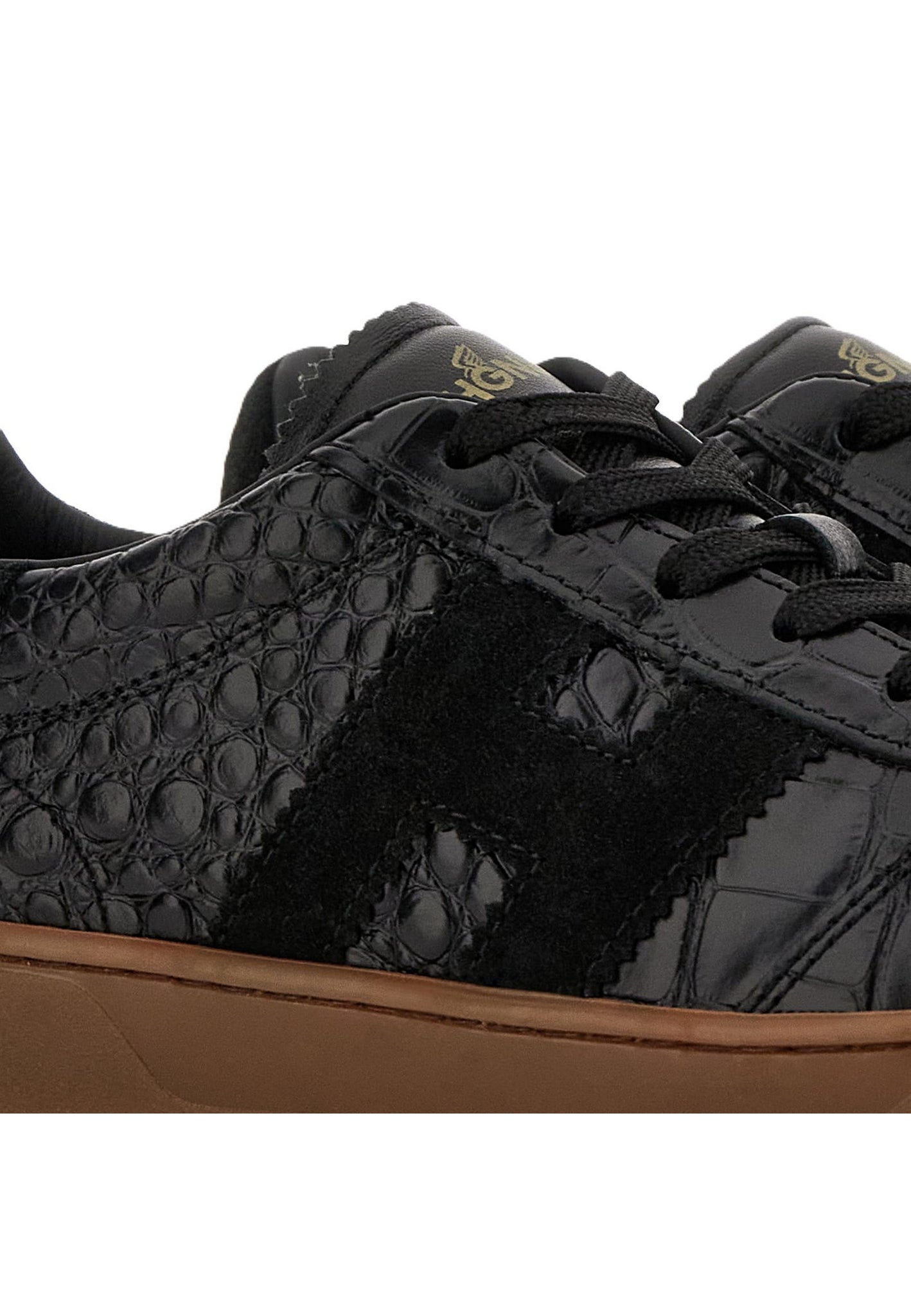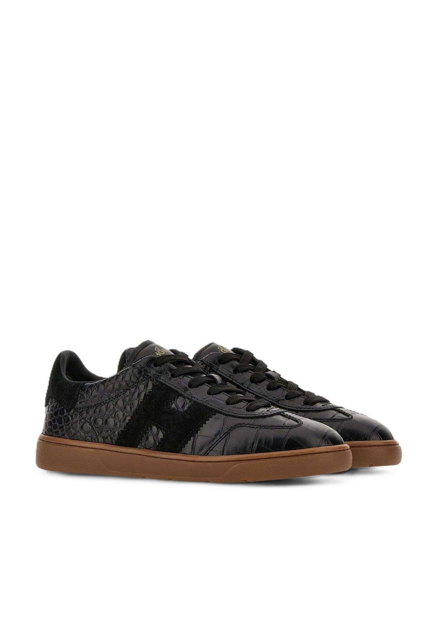 Perfetto equilibrio tra ispirazioni retrò e design contemporaneo, le sneakers Hogan Cool si distinguono per il loro stile sobrio ed elegante. La tomaia, realizzata in pelle con stampa coccodrillo, è impreziosita da una H laterale dentellata in suede, mentre la linguetta imbottita aggiunge un tocco di comfort e morbidezza. La suola, dal profilo distintivo, riprende il motivo del monogramma obliquo presente sul battistrada, completando il look con un segno grafico deciso. Il sottopiede in memory foam assicura una calzata comoda e ammortizzata, ideale per accompagnare ogni passo con stile.