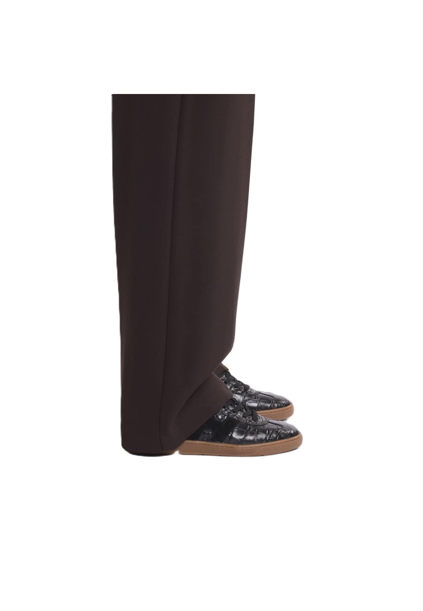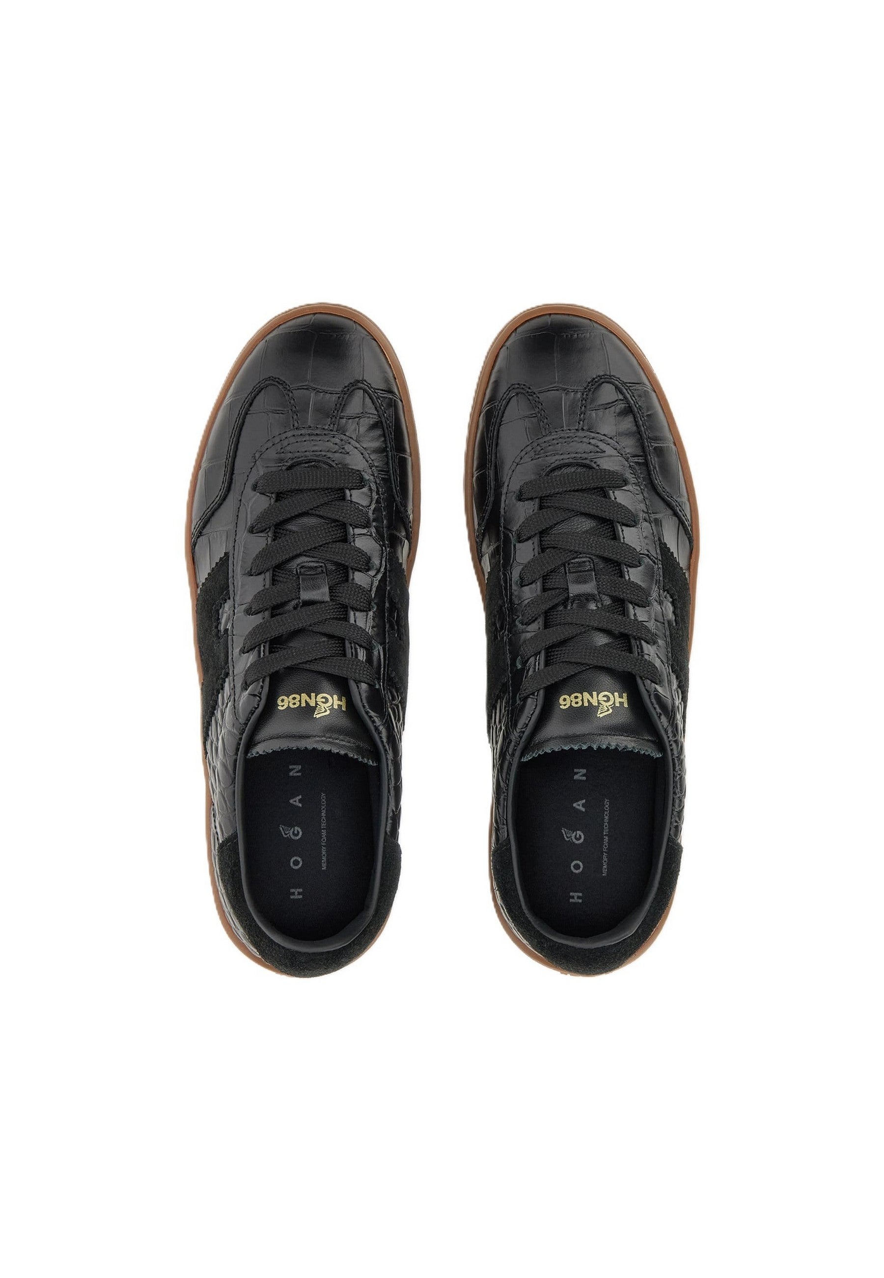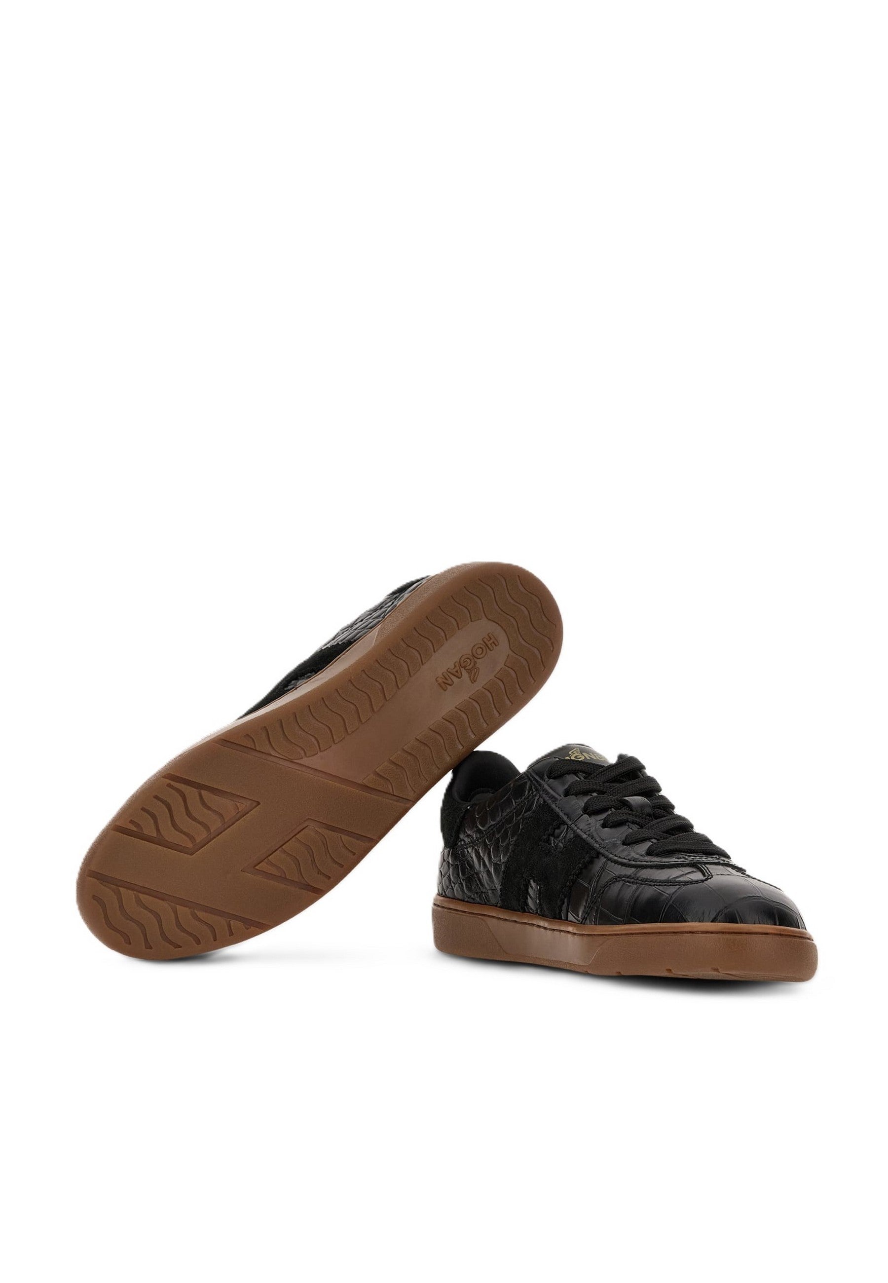 Perfetto equilibrio tra ispirazioni retrò e design contemporaneo, le sneakers Hogan Cool si distinguono per il loro stile sobrio ed elegante. La tomaia, realizzata in pelle con stampa coccodrillo, è impreziosita da una H laterale dentellata in suede, mentre la linguetta imbottita aggiunge un tocco di comfort e morbidezza. La suola, dal profilo distintivo, riprende il motivo del monogramma obliquo presente sul battistrada, completando il look con un segno grafico deciso. Il sottopiede in memory foam assicura una calzata comoda e ammortizzata, ideale per accompagnare ogni passo con stile.