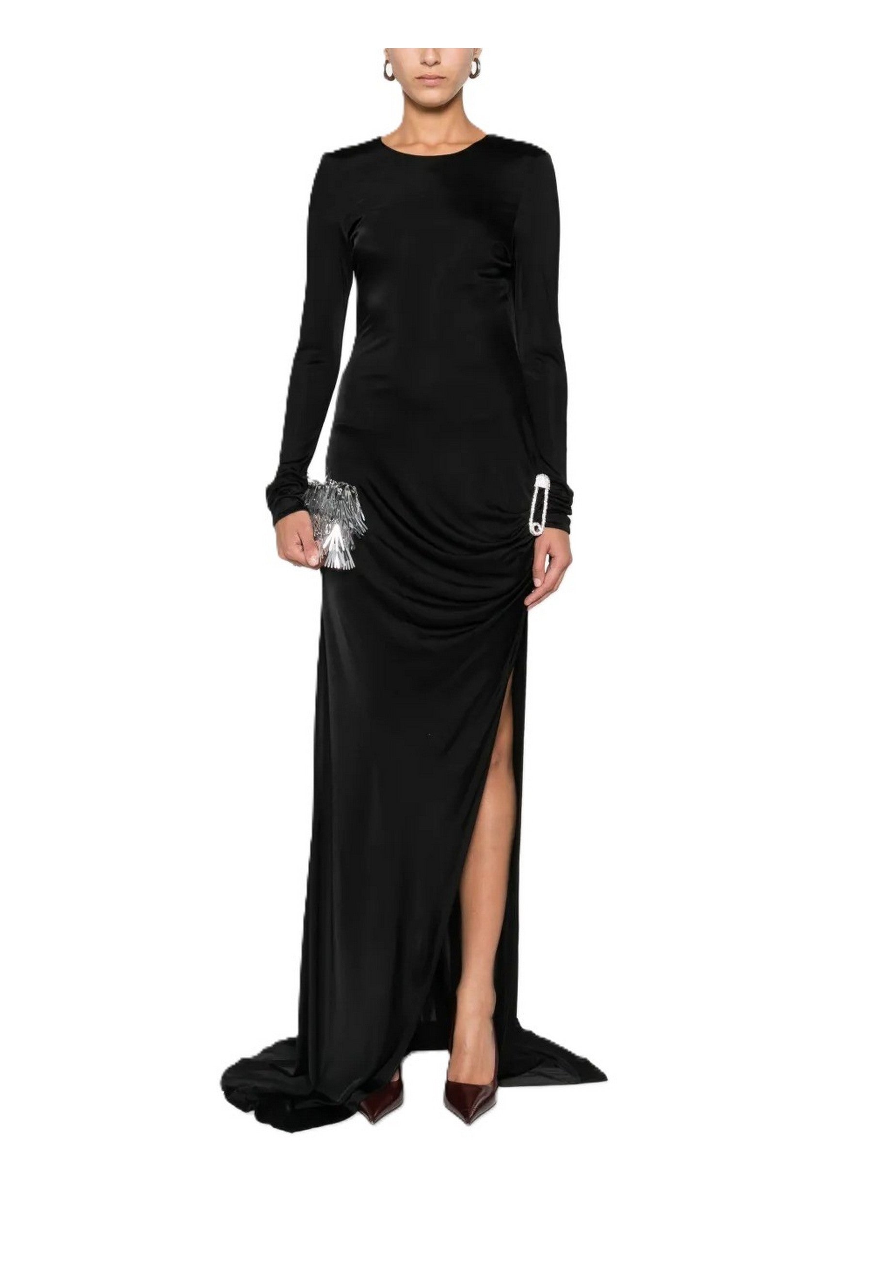 Long dress da donna di manifattura italiana realizzato in jersey lucido elasticizzato, ideale per valorizzare la silhouette con eleganza e comfort. Il modello presenta un raffinato dettaglio arricciato sul lato, impreziosito da una spilla gioiello decorativa, che dona luce e movimento al design.