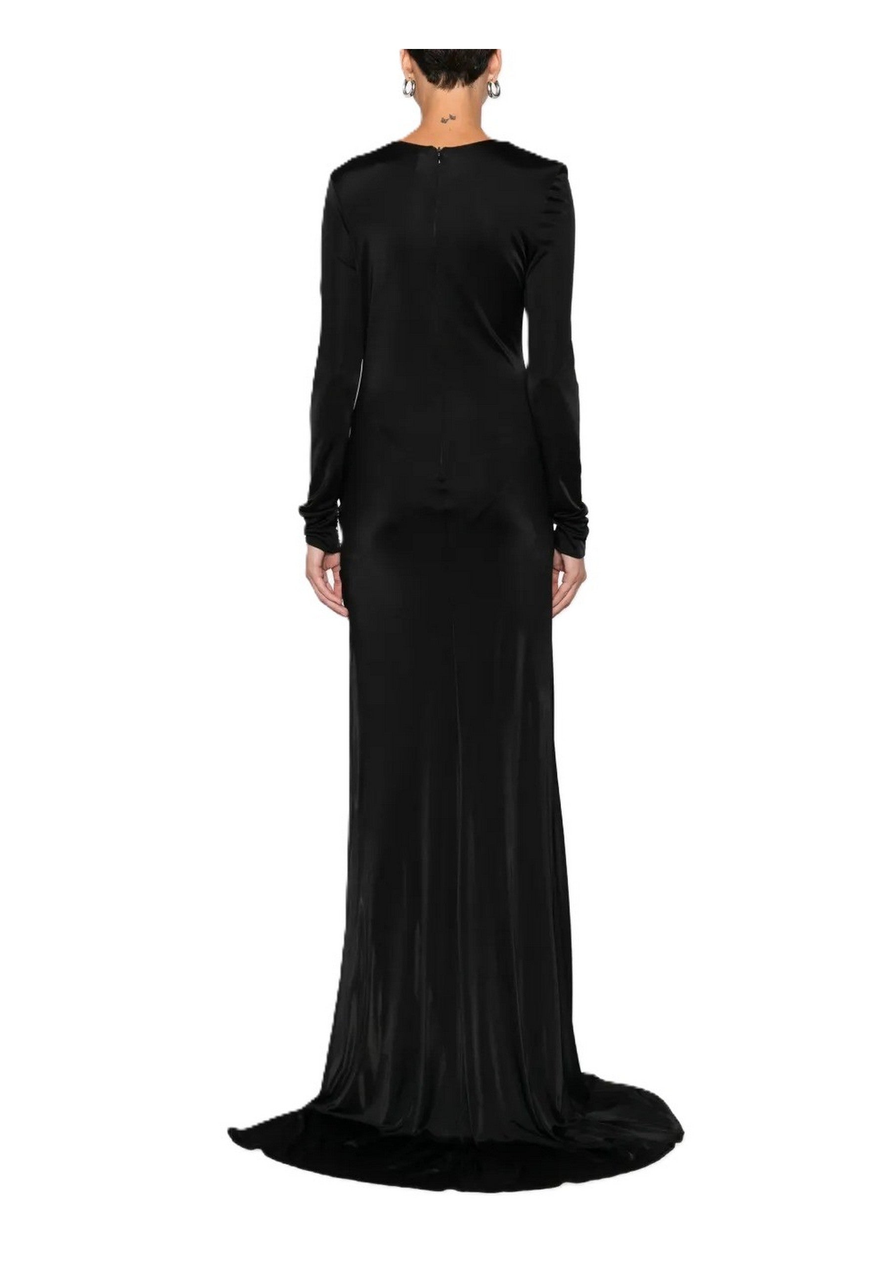 Le maniche lunghe e la chiusura con zip sul retro assicurano una vestibilità pratica e impeccabile, mentre il fondo leggermente svasato equilibra la linea slanciata del capo. La vestibilità slim fit rende questo abito lungo perfetto per eventi serali, cerimonie e occasioni eleganti.