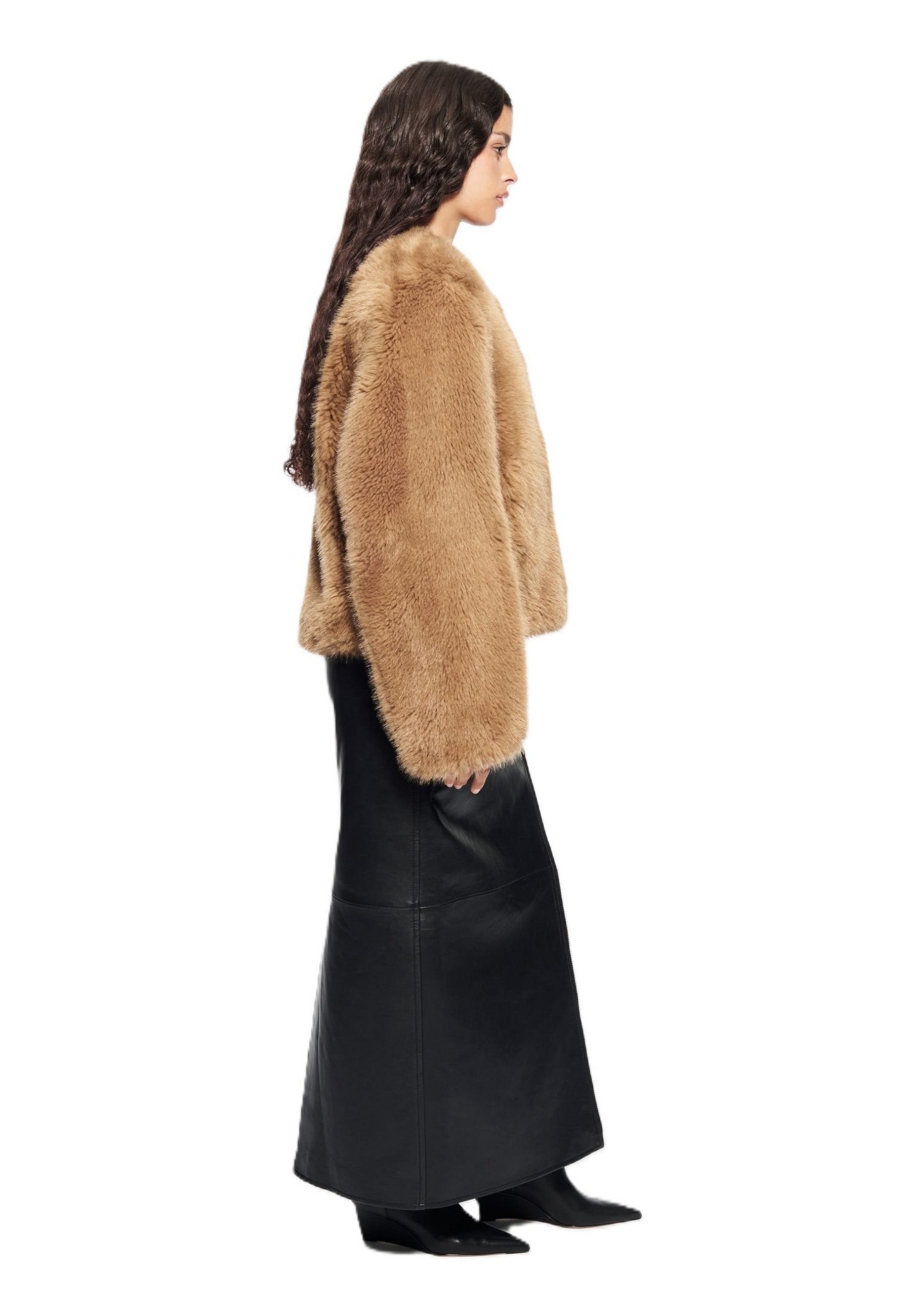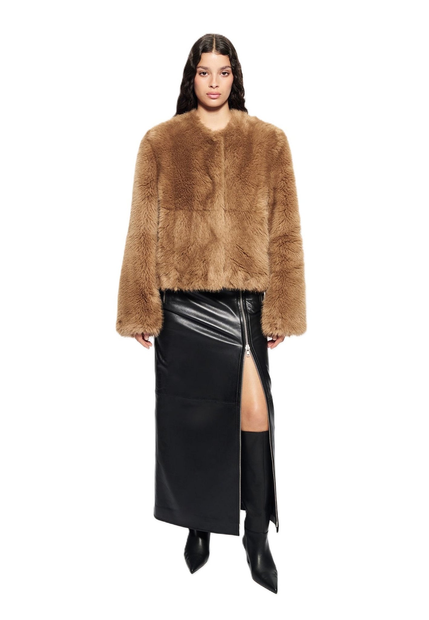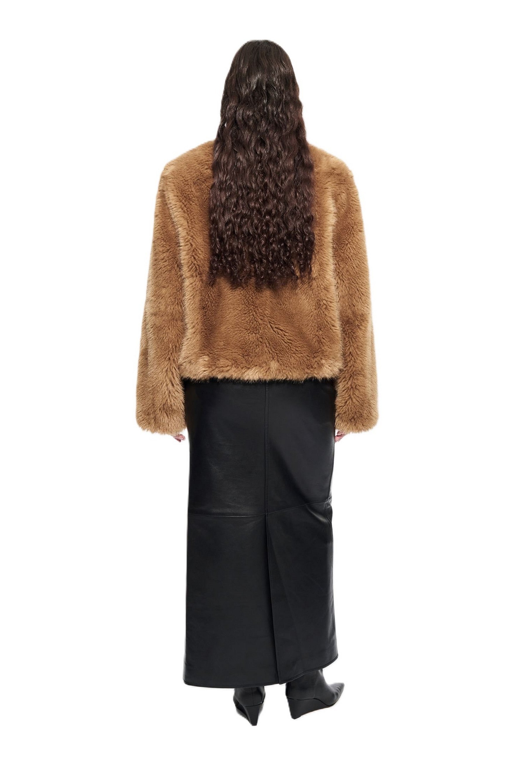 Il cappotto Halle è un capo unico che combina stile e personalità. Realizzato in morbida pelliccia sintetica con motivo patchwork, dona movimento e carattere a ogni look, mantenendo una silhouette dritta e linee pulite.
