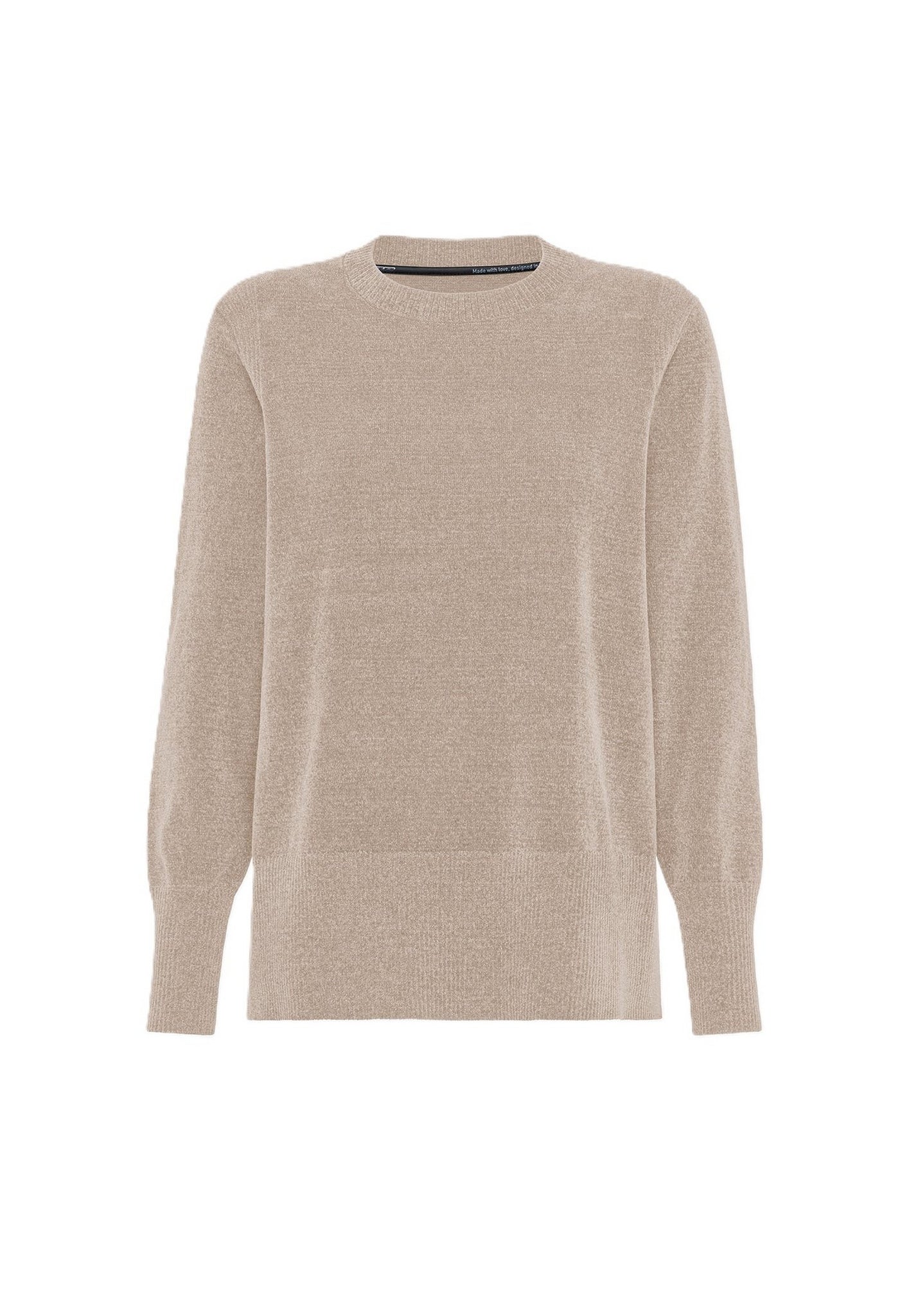 Questa maglia in ciniglia a girocollo unisce morbidezza e versatilità, ideale per look informali o casual chic. La maglia rasata mette in risalto la texture soffice, mentre gli spacchi laterali, i polsi e il fondo evidenti e le spalle a punto sella aggiungono un tocco grafico al design minimalista.