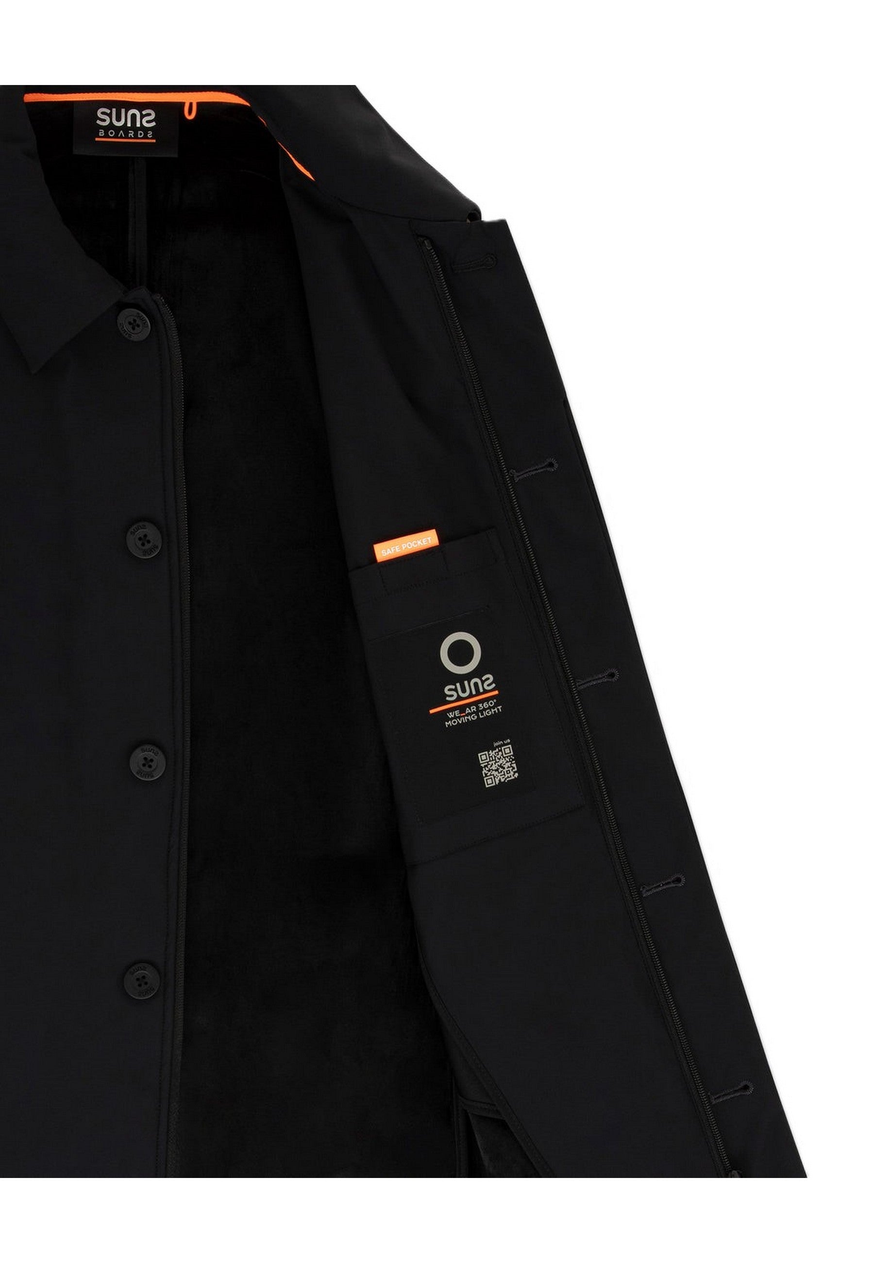A completare il look, due dettagli iconici del brand Suns: la pinnetta arancione fluo sul fianco destro e il logo reflective sulla manica sinistra, per un tocco distintivo e riconoscibile.