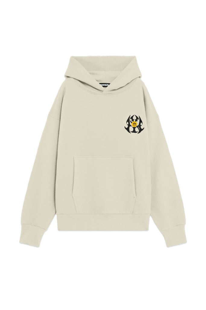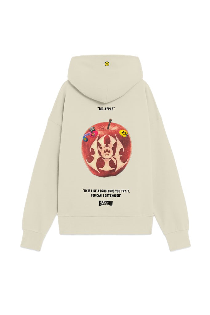 Felpa con cappuccio in 100% cotone dal fit oversize, dotata di tasca a marsupio. Sul petto, l'iconica patch smile applicata, mentre il retro è animato da una maxi stampa grafica “BIG APPLE” con testi e logo BARROW. Un mix di comfort e identità visiva decisa.