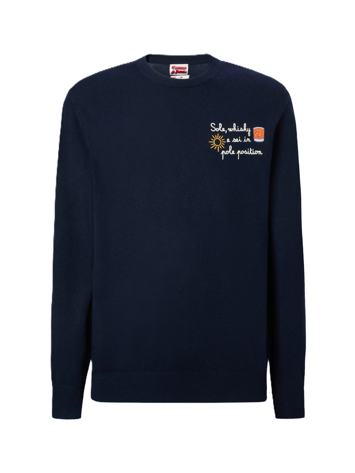 maglione a girocollo con ricamo Sole, wishky e sei in pole position!