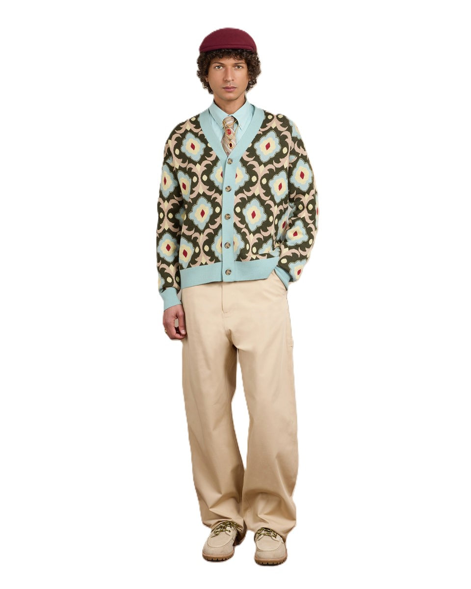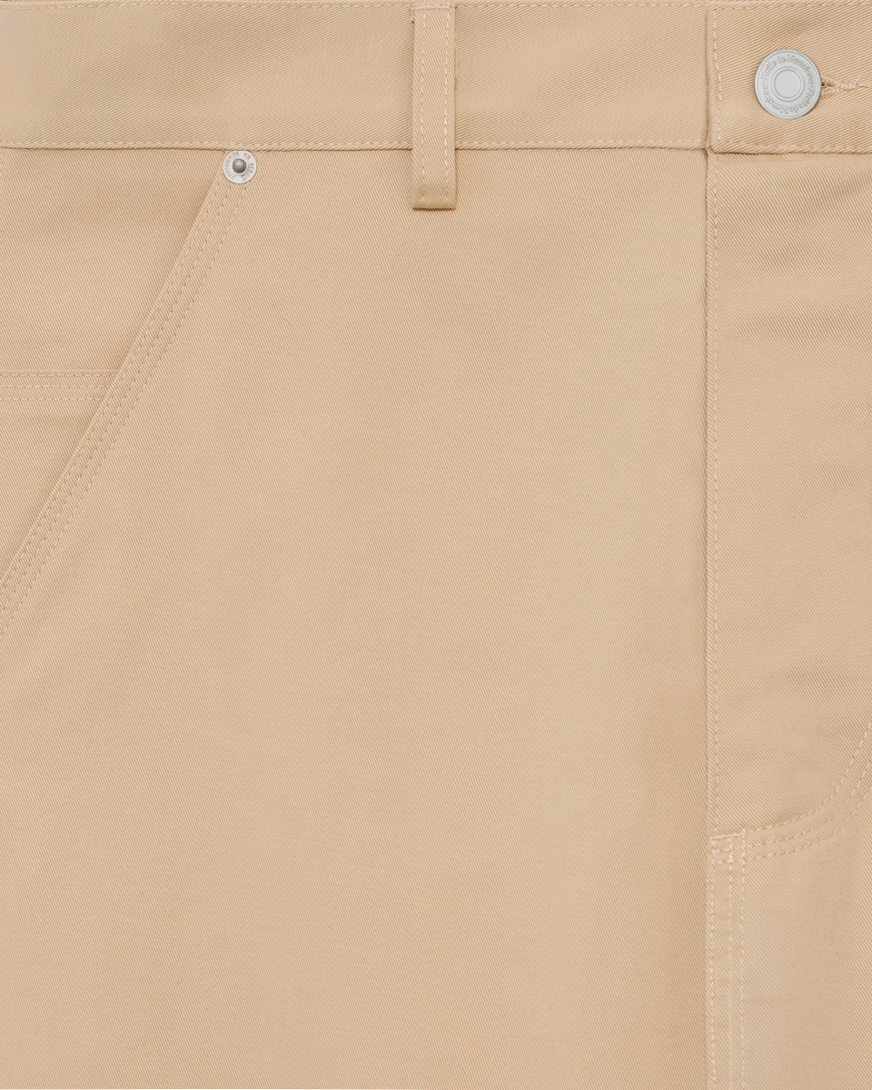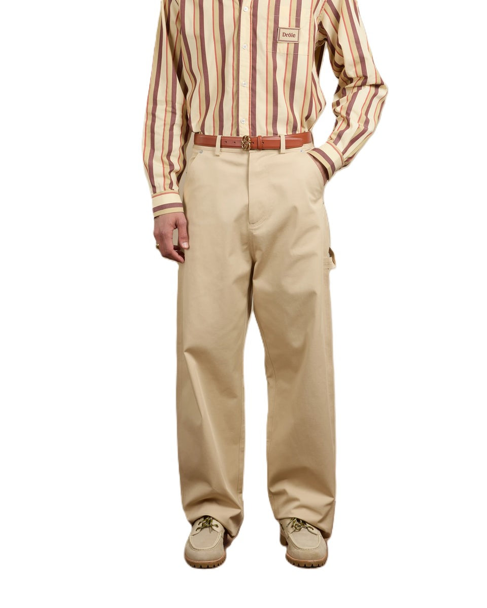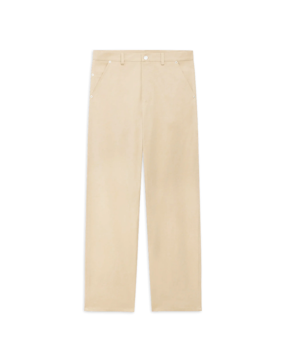 Pantaloni denim beige 5 tasche in 100% cotone, con dettaglio da carpentiere e inserto in pizzo Tresse. Vestibilità oversize, vita bassa, rivetti incisi sulle tasche frontali, patch in pelle sul retro e bottone denim inciso.