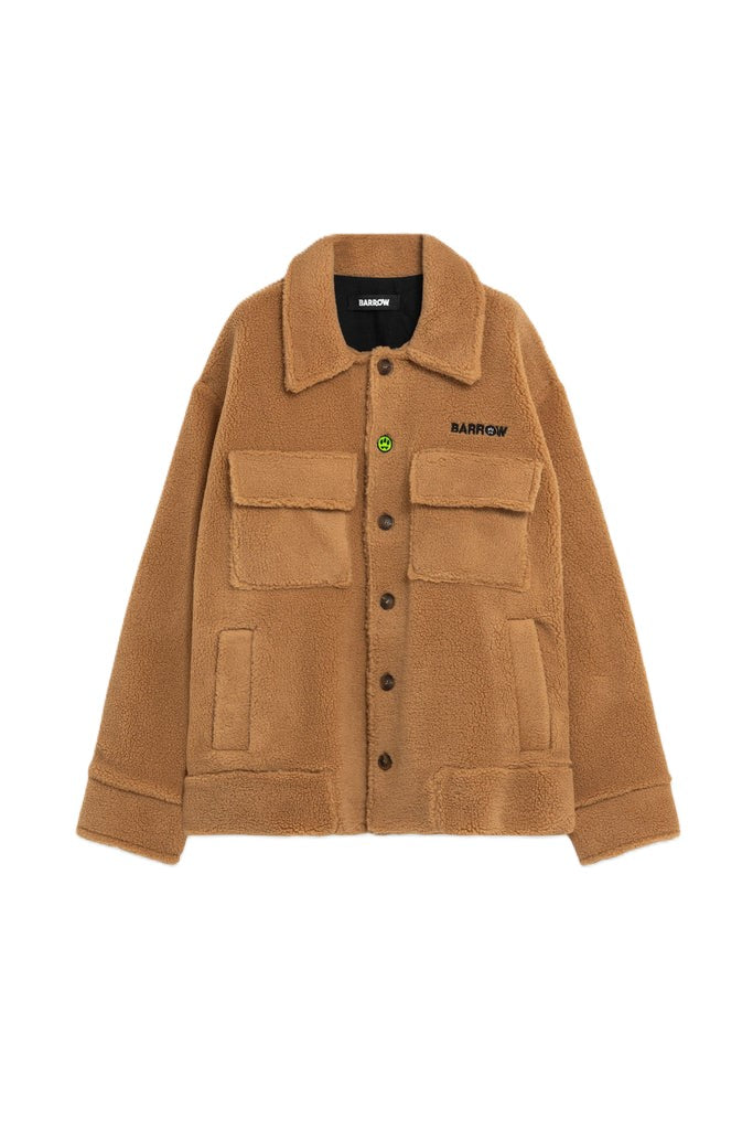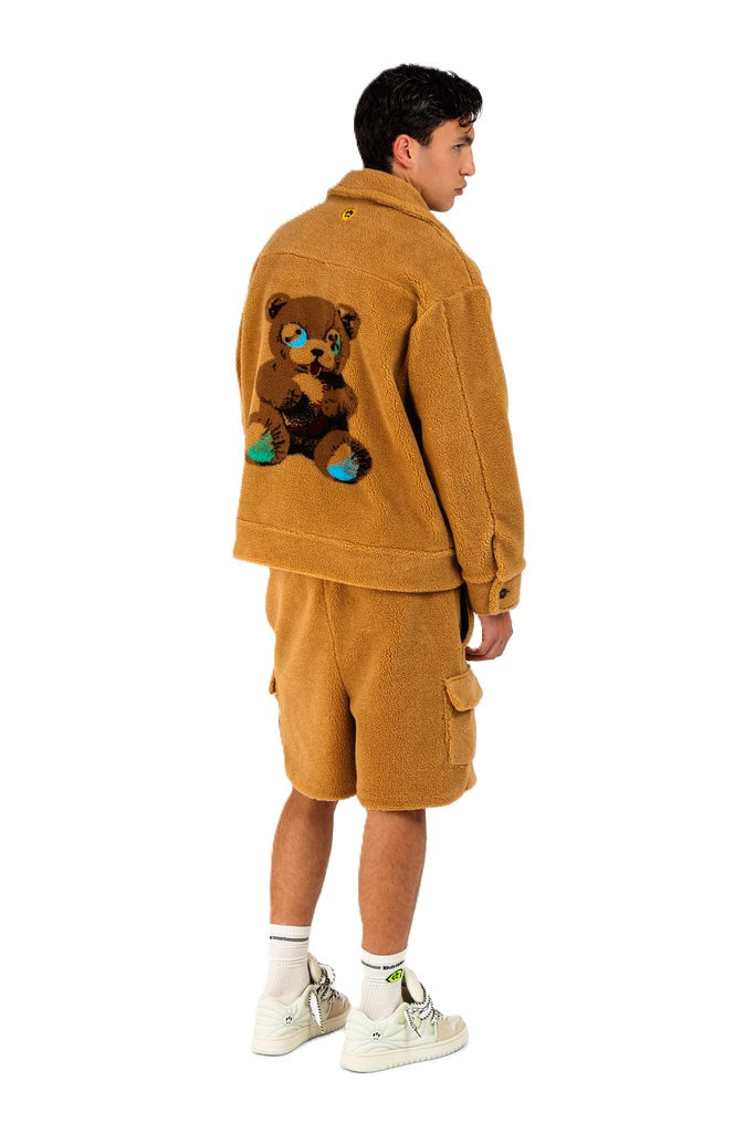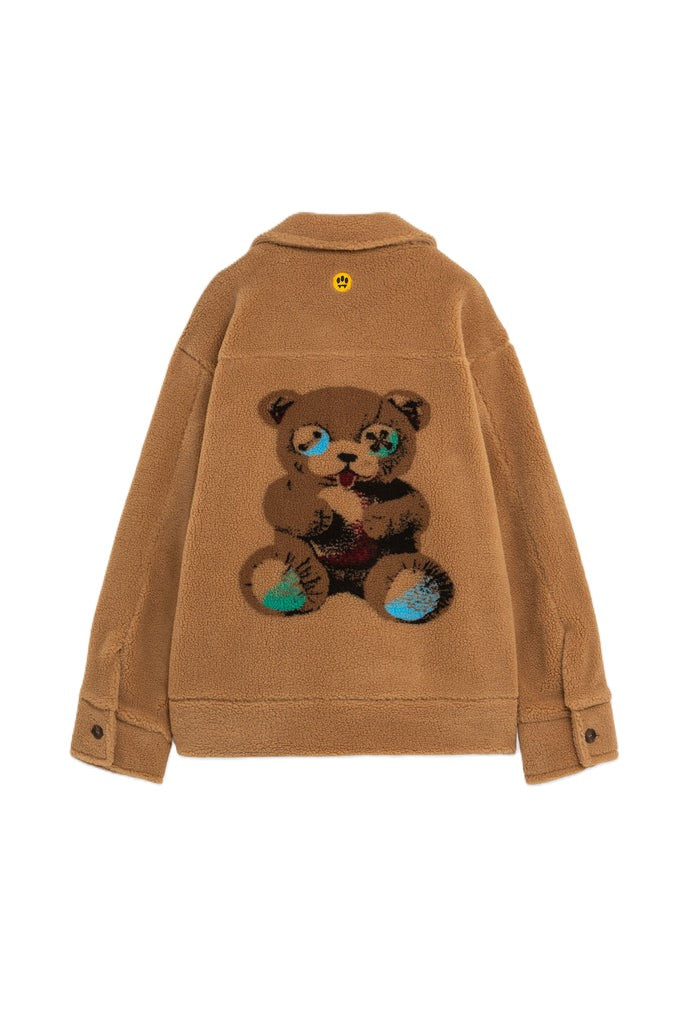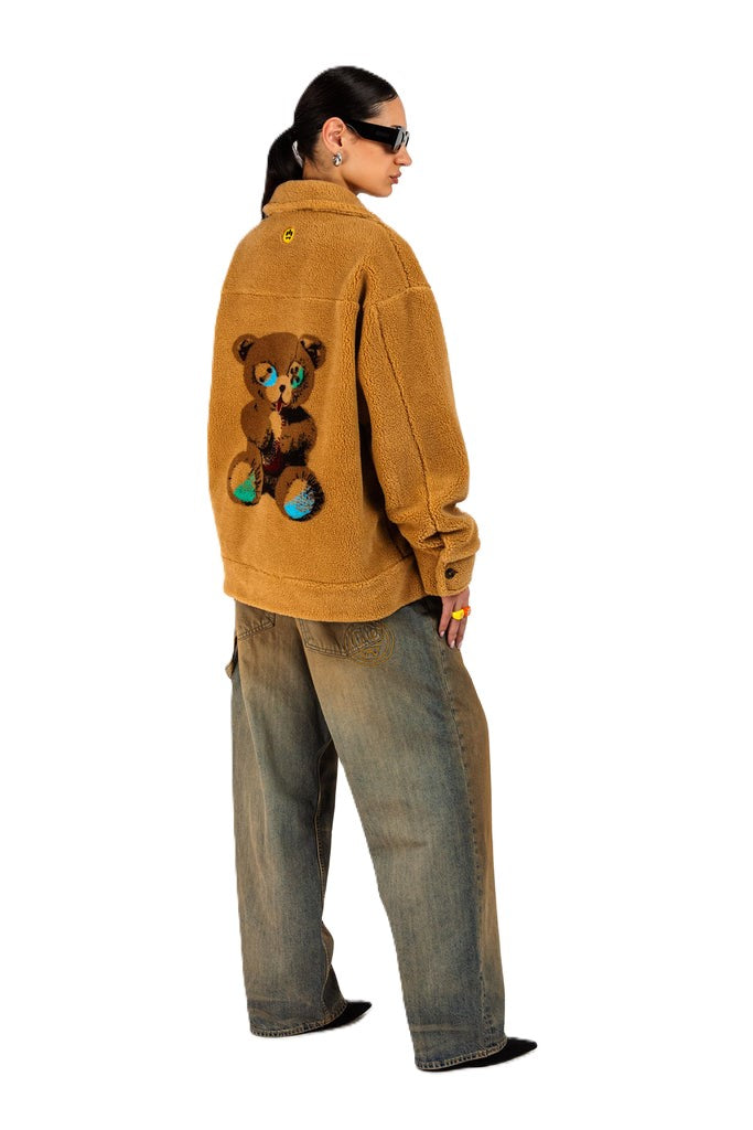 Giacca in ecofur 100% poliestere con colletto stile camicia e chiusura frontale con bottoni. Dotata di tasche con pattina e logo ricamato sul petto. Il retro è impreziosito da una grafica orsetto stampata, mentre il dettaglio finale è una patch smile applicata sul retrocollo.