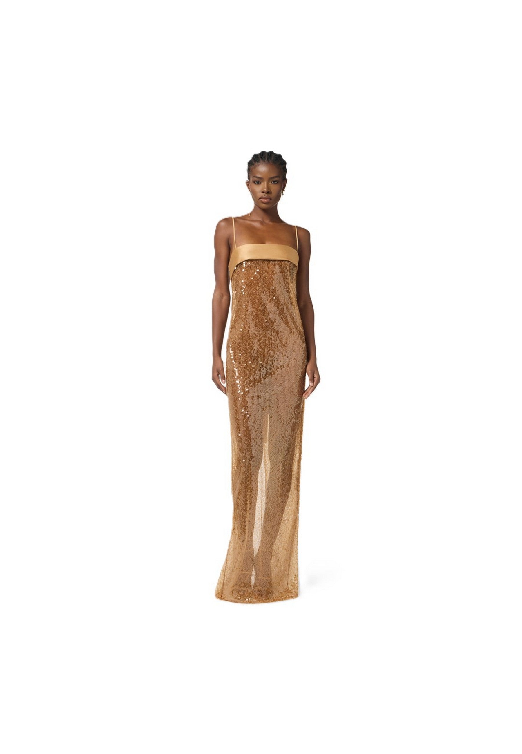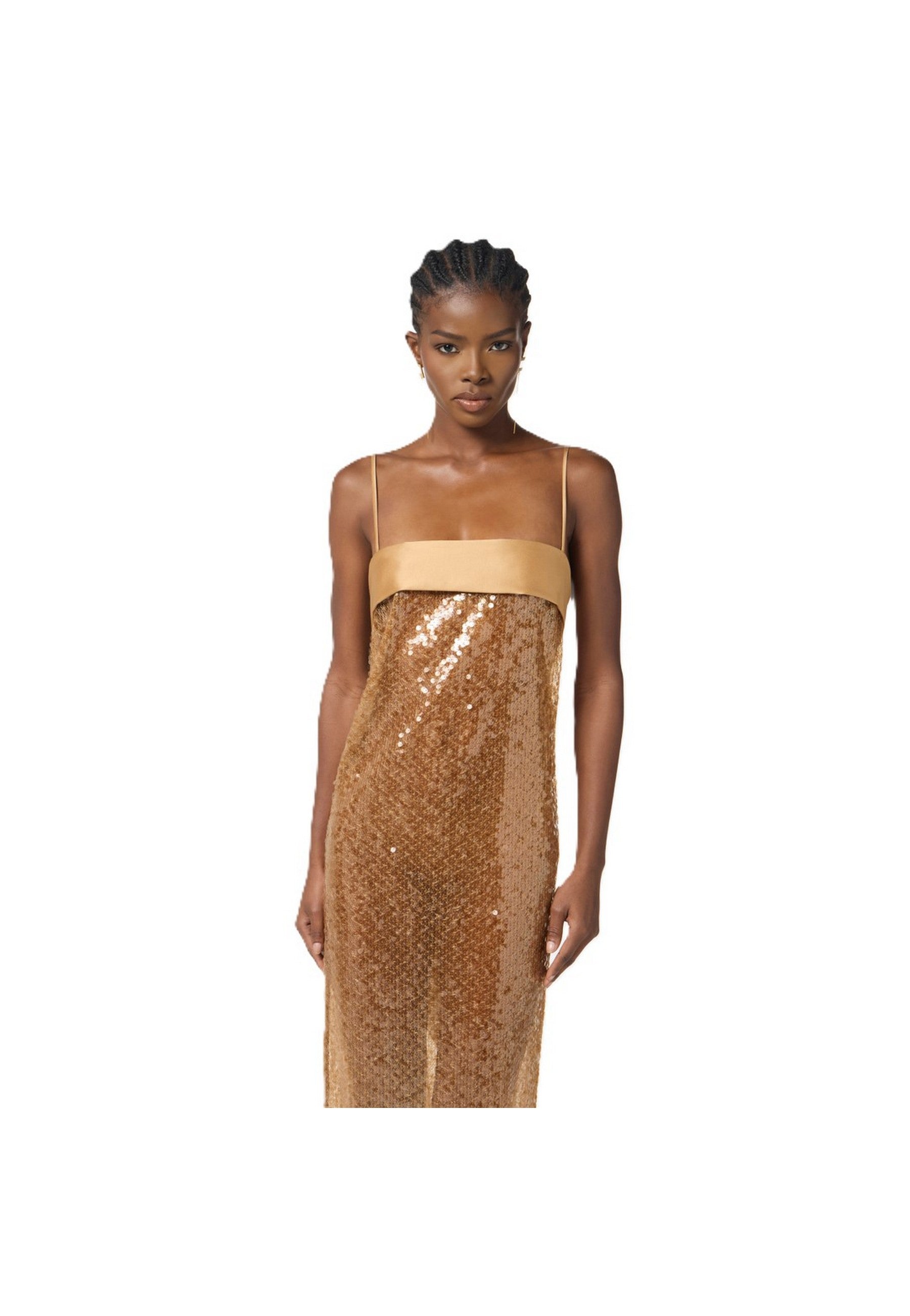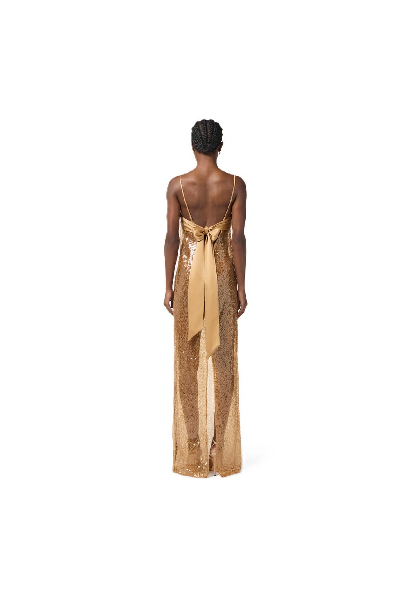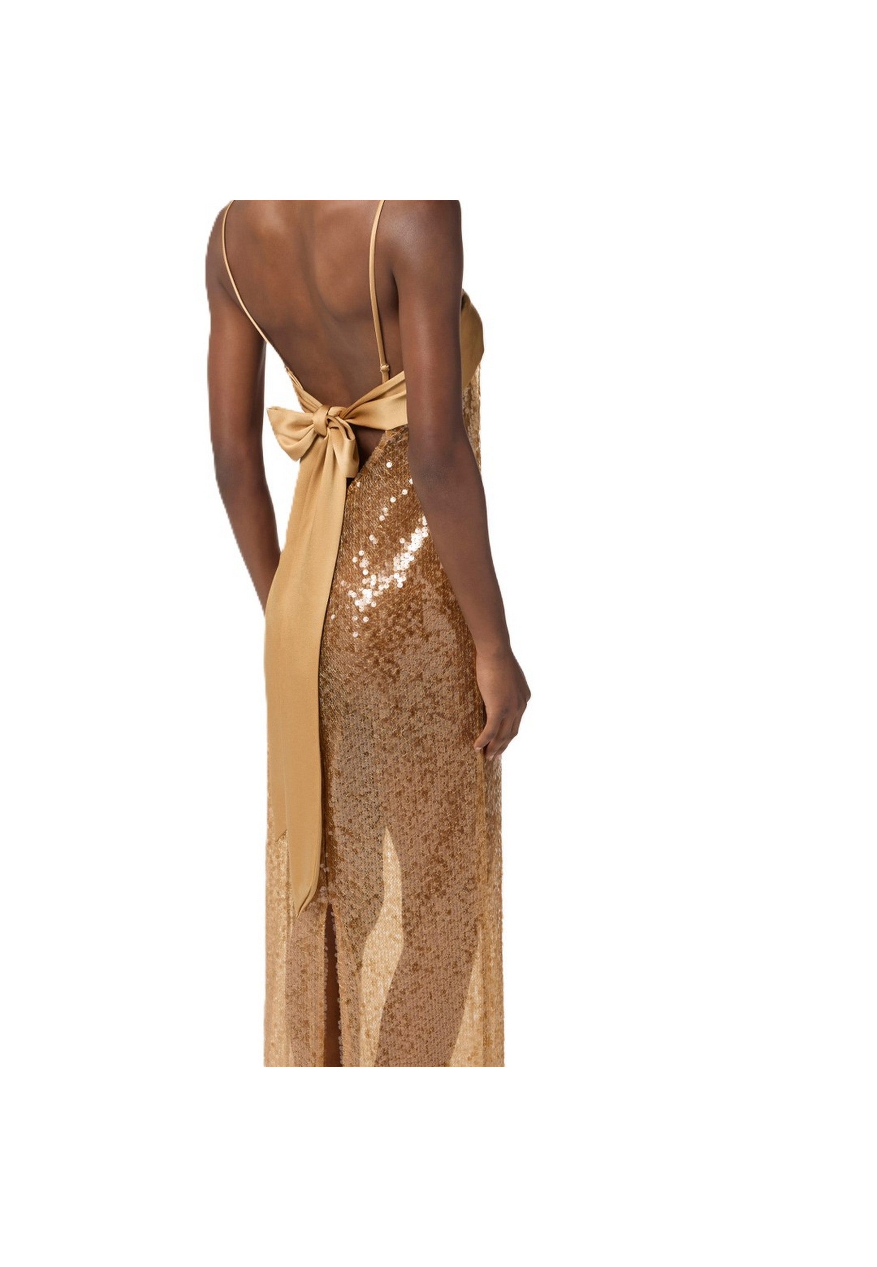 Un'eleganza che cattura la luce: questo abito da sera dalla vestibilità slim è interamente rivestito di paillettes, per un effetto luminoso e scenografico. Le spalline sottili donano delicatezza alla silhouette, mentre la fascia in raso che avvolge il busto si trasforma sul retro in una raffinata fusciacca da annodare. La schiena è protagonista grazie a un profondo scollo a V, sensuale e sofisticato. Completa il design lo spacco posteriore, che aggiunge un tocco audace al passo.