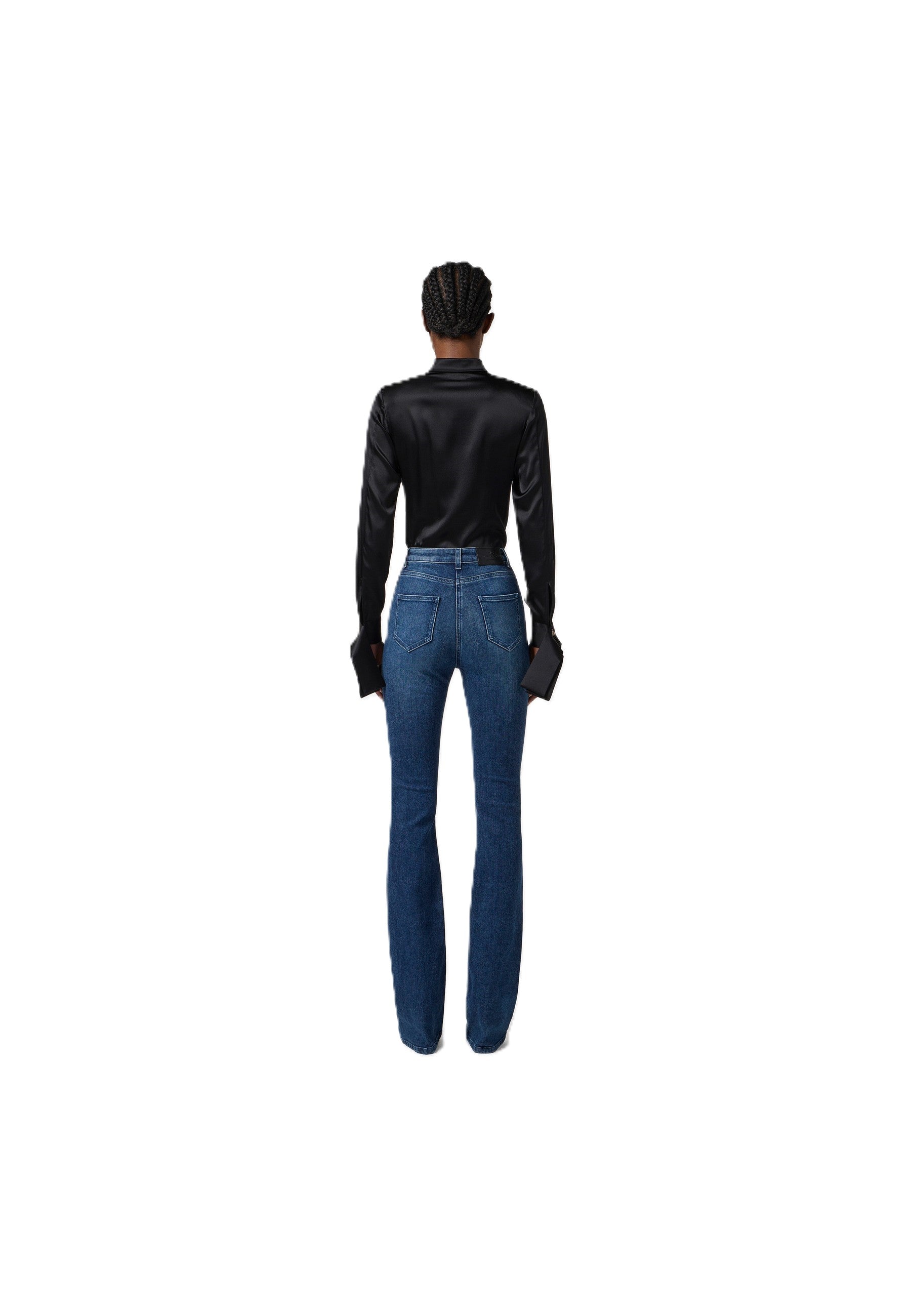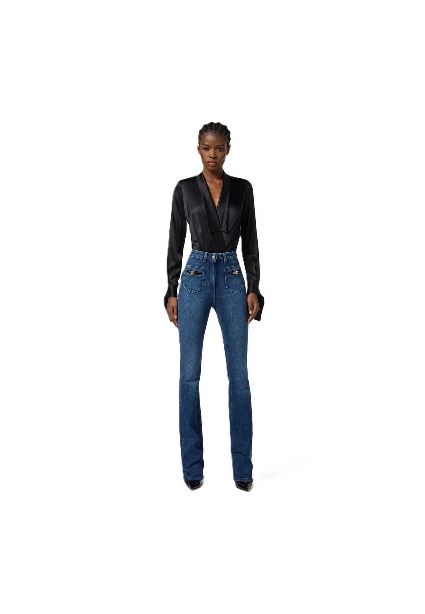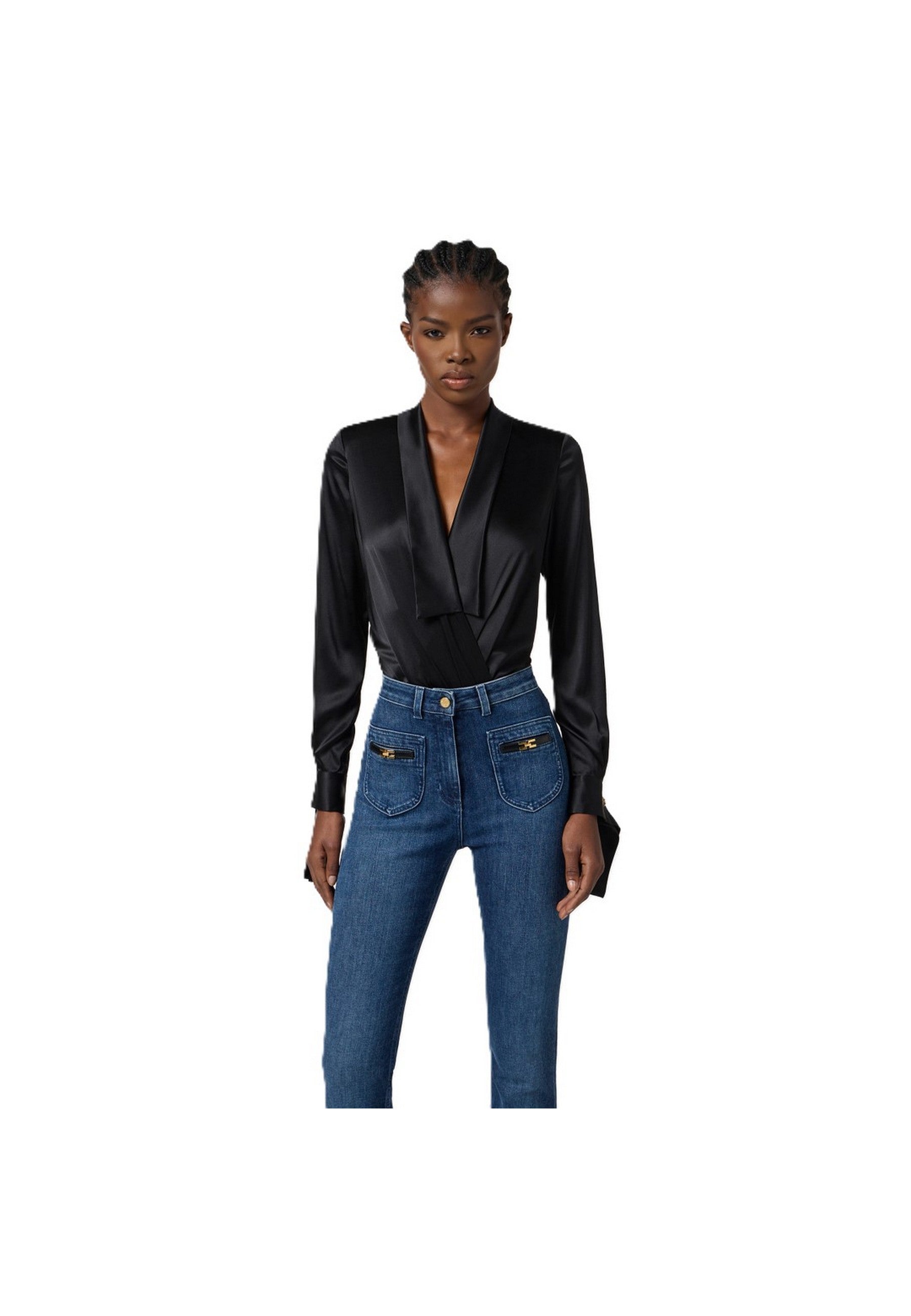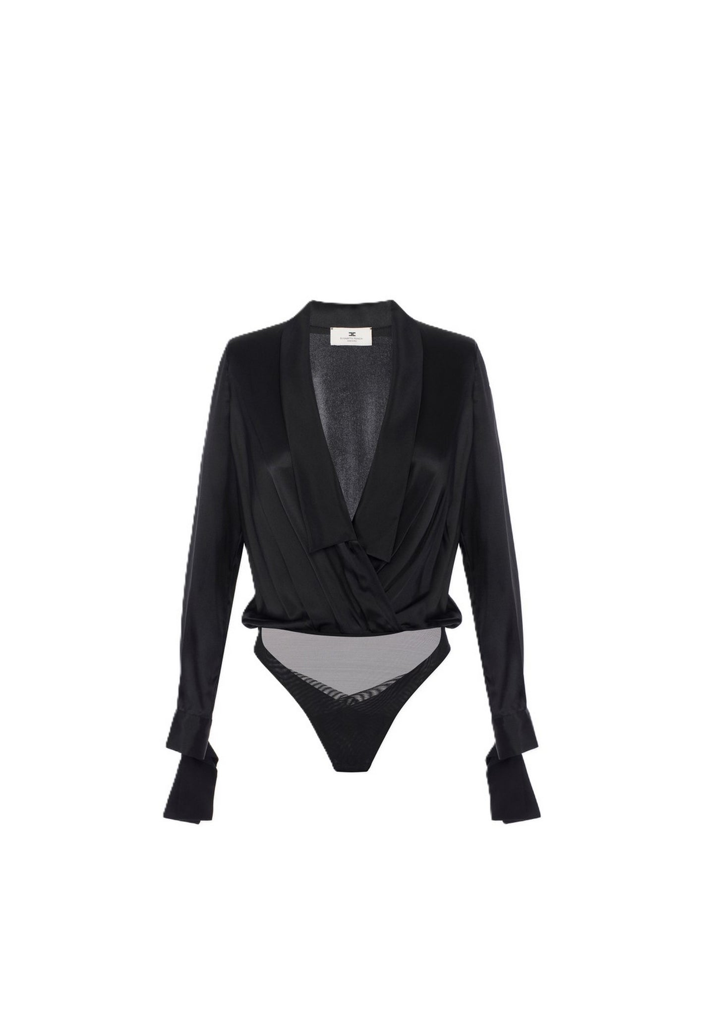 Body in raso dalla vestibilità slim. Ha spalle strutturate e collo con rever sciallato. Si distingue per i volumi incrociati sul davanti. I polsi con taglio foulard regalano leggerezza. I bottoni smaltati con pattern di ispirazione snake impreziosiscono il capo.
