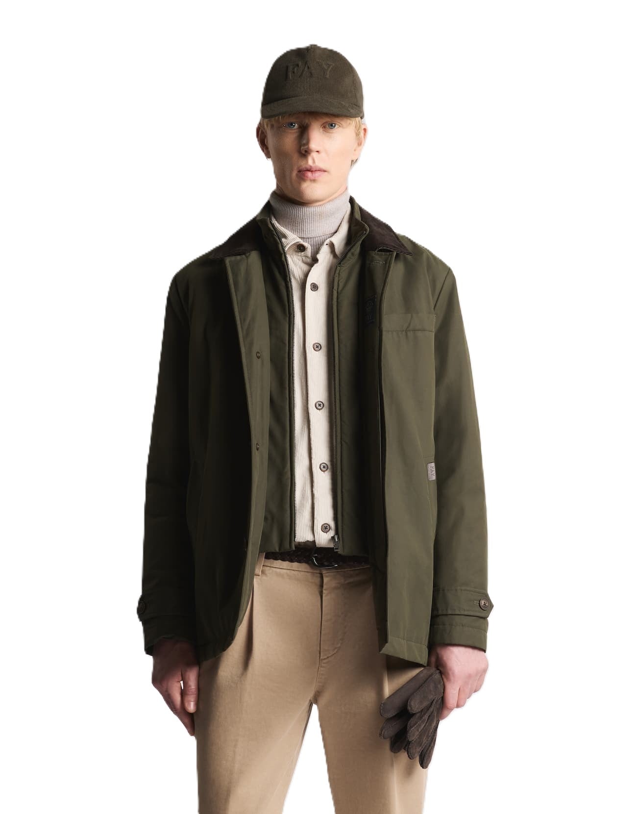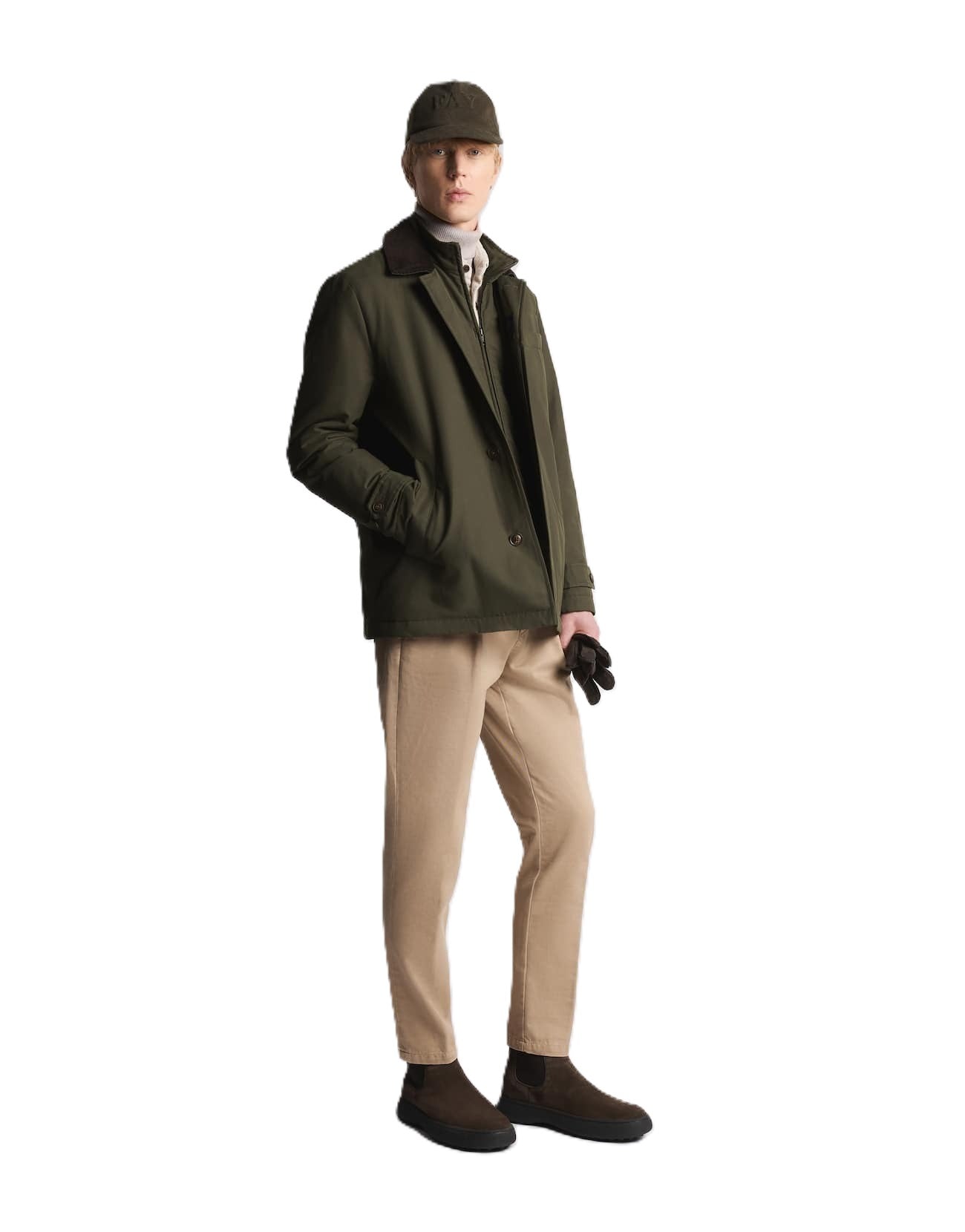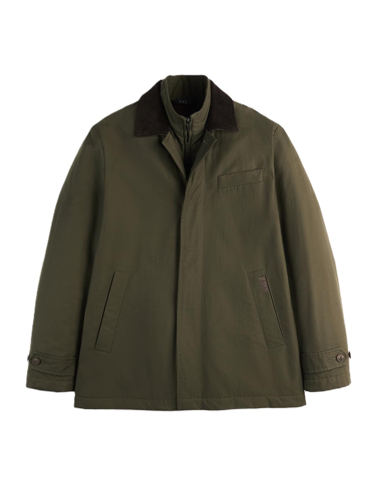 Ispirato allo stile british, questo modello presenta tasche a filo laterali, una delle quali valorizzata dall’etichetta in pelle con logo Fay, e un taschino pochette. Completano il capo una chiusura con zip e bottoni nascosti, oltre a una pratica tasca interna.