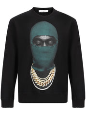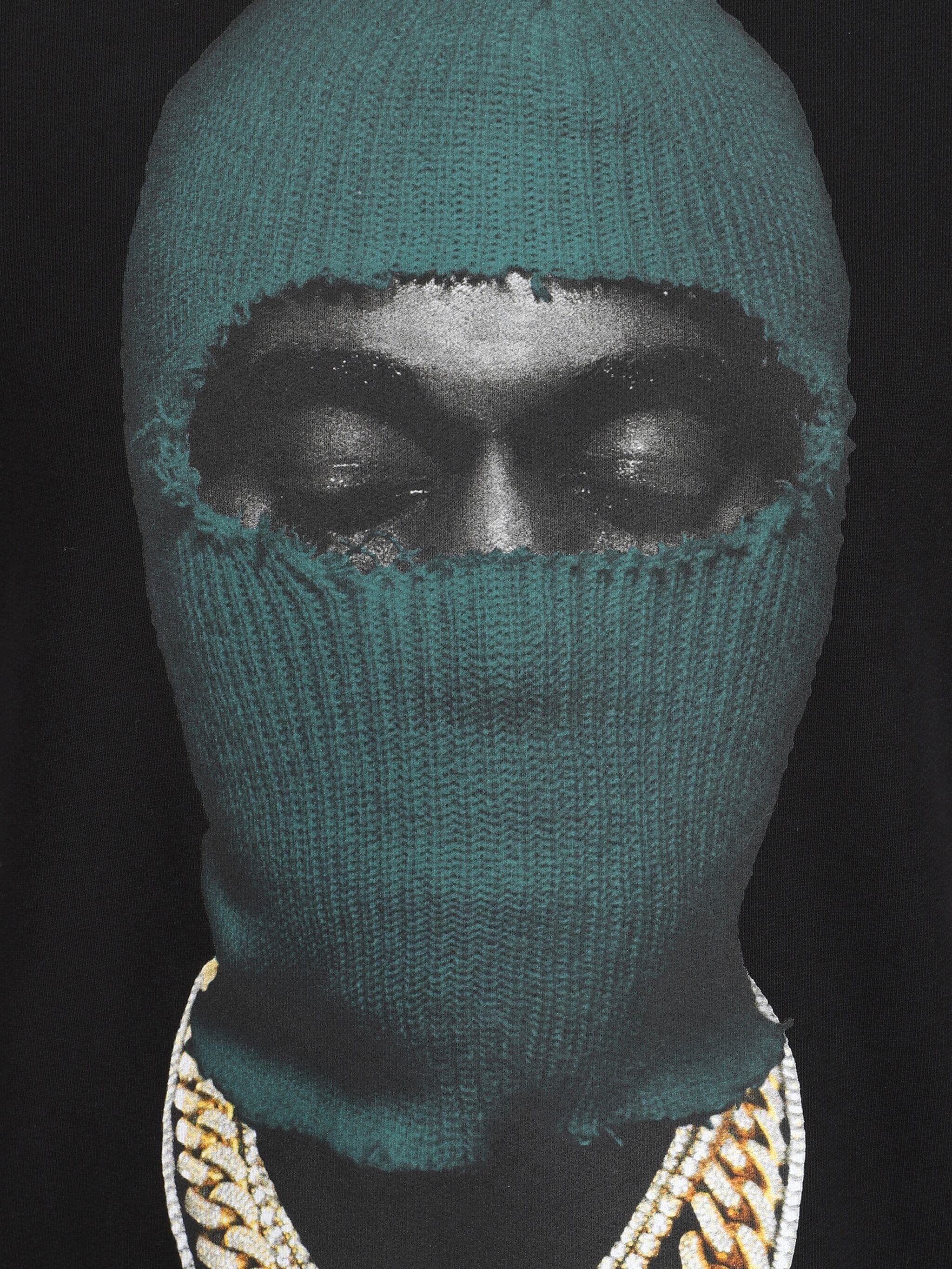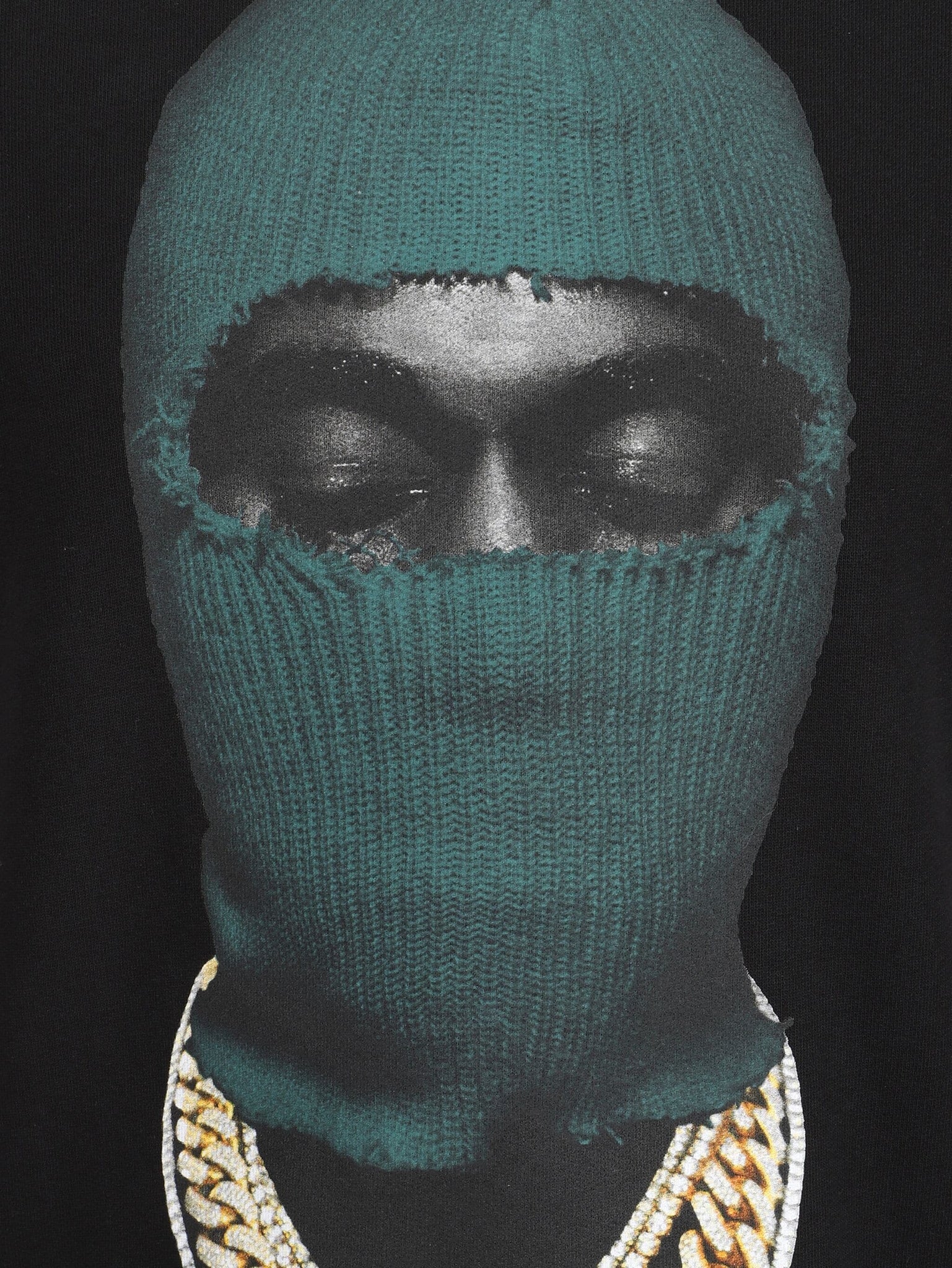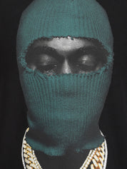 Realizzata in cotone premium, presenta una stampa frontale audace che ritrae un volto coperto da passamontagna verde con dettagli in rilievo e catene dorate iperrealistiche. Un design che fonde streetwear e arte visiva, pensato per chi vuole distinguersi.