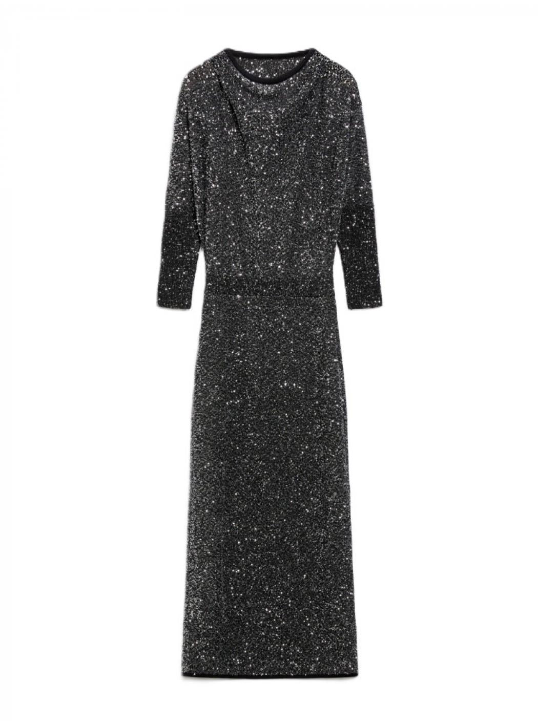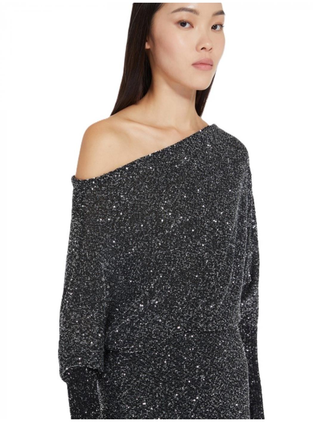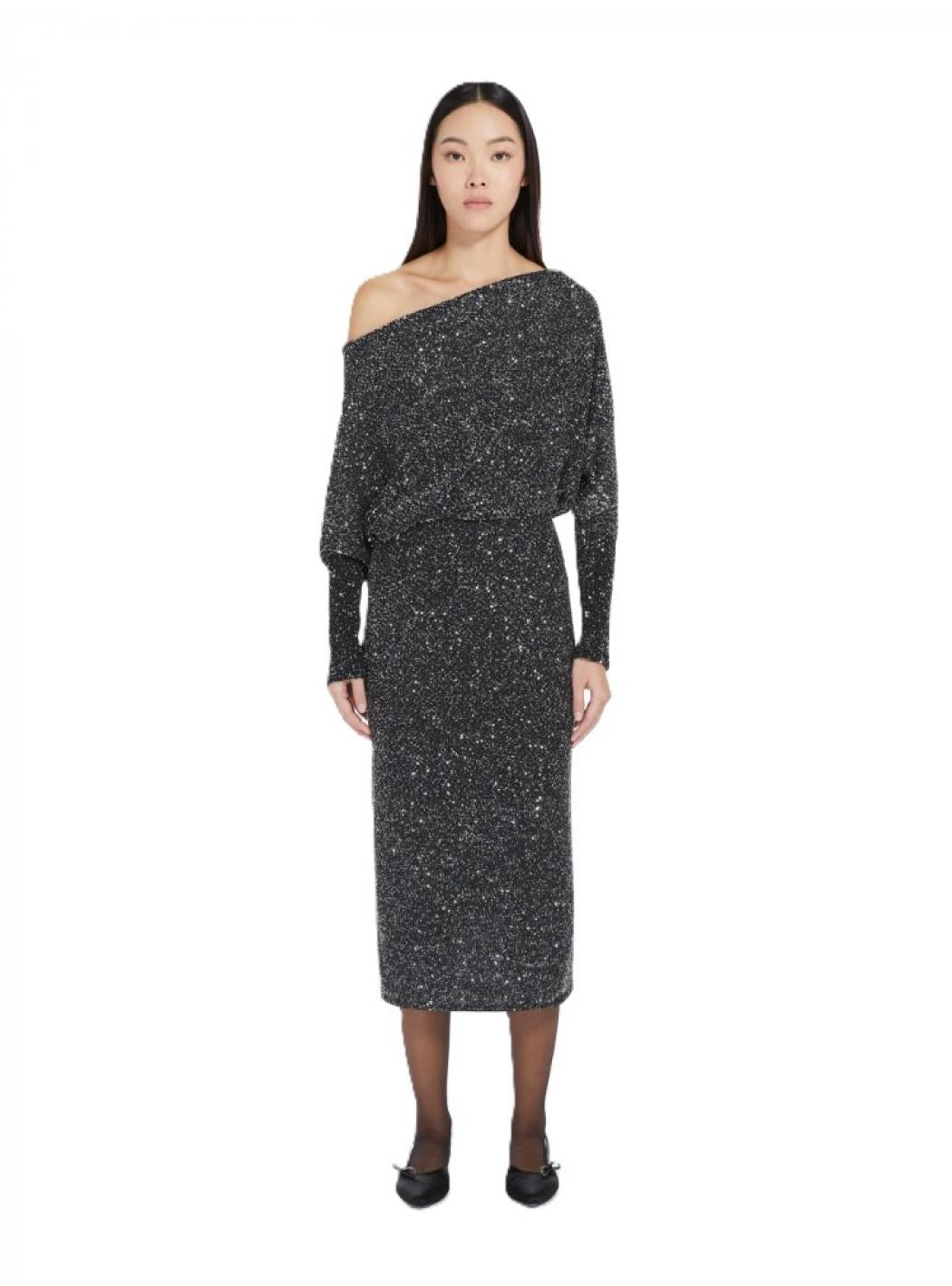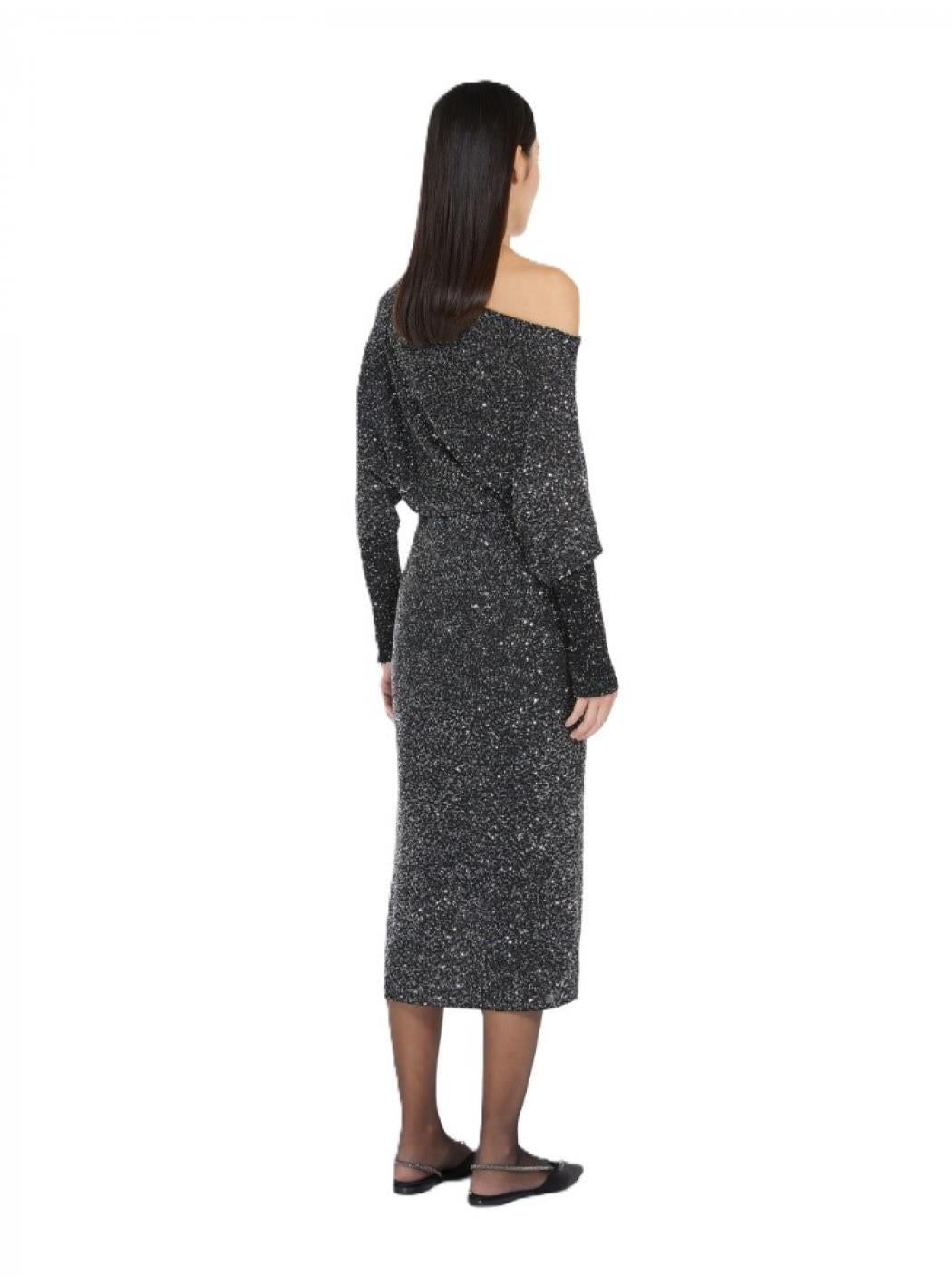 Abito Lurex Monospalla – Nero GlitterUn look sofisticato e glamour per le tue serate speciali. Questo abito lungo in tessuto lurex nero con dettagli glitterati regala un effetto brillante e raffinato, perfetto per eventi, feste e occasioni eleganti. Il design monospalla dona sensualità e movimento, mentre la silhouette morbida nella parte superiore si bilancia con una gonna a tubino aderente, valorizzando la figura con discrezione.Il tessuto elasticizzato assicura comfort e libertà nei movimenti, mentre le maniche lunghe e la lunghezza midi rendono l’abito adatto anche alle stagioni più fresche.